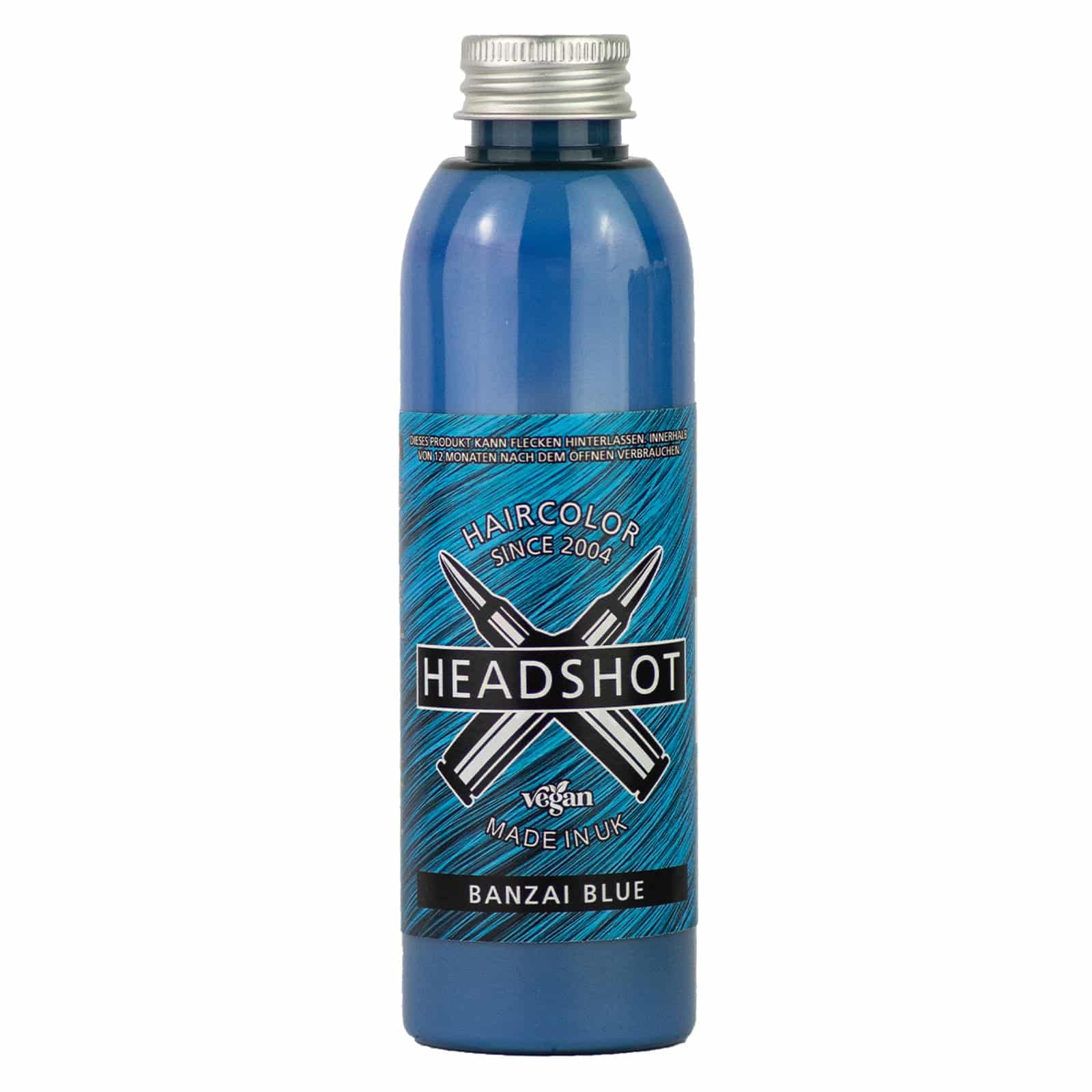Mit 150 ml Inhalt ist in den Headshot Flaschen deutlich mehr Farbe enthalten als bei anderen Marken. Die Farbe ist vegan, tierversuchsfrei und wird in Europa hergestellt. Headshot „Banzai Blue“ ist ein hellblauer Pastellton, keine deckende Haarfarbe.