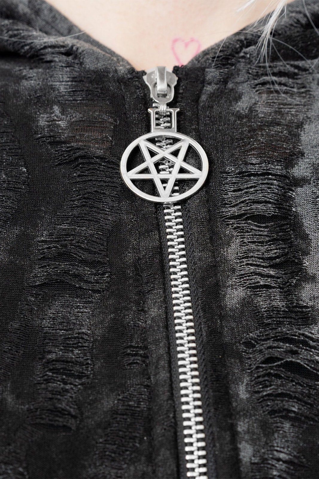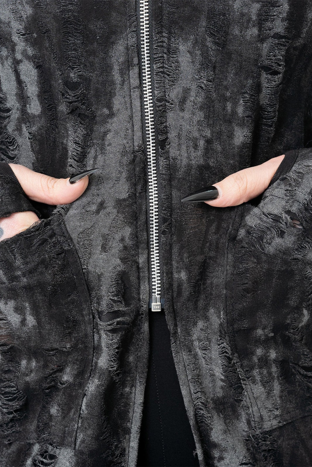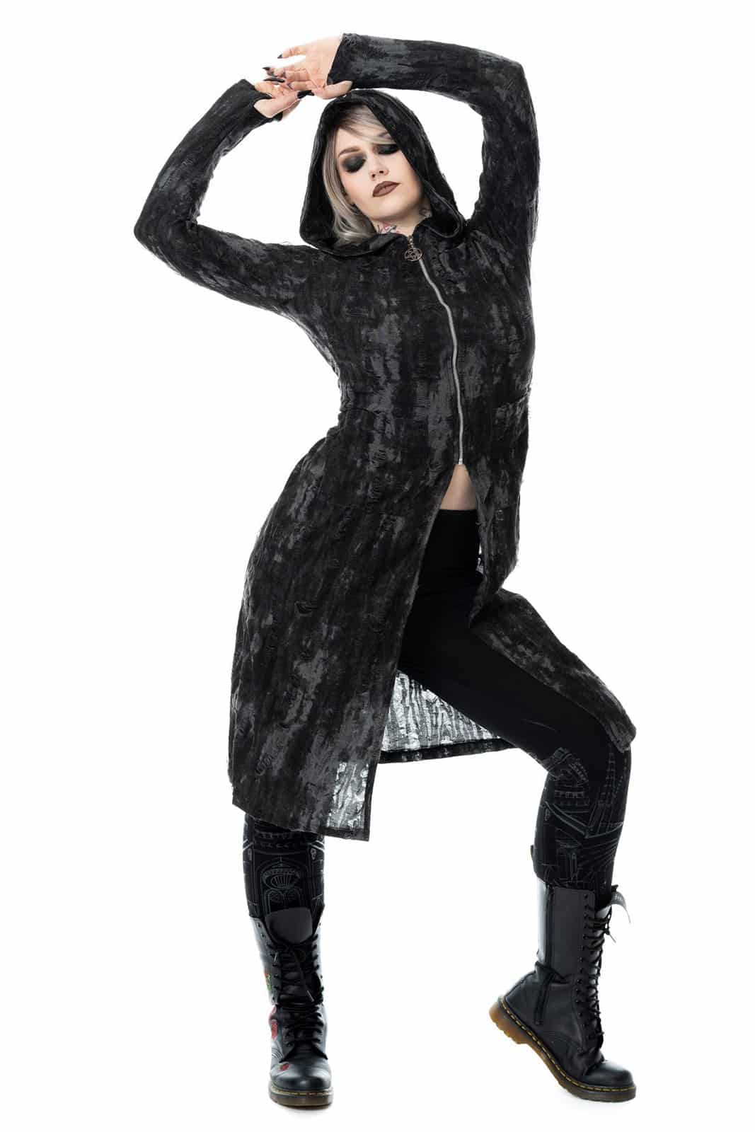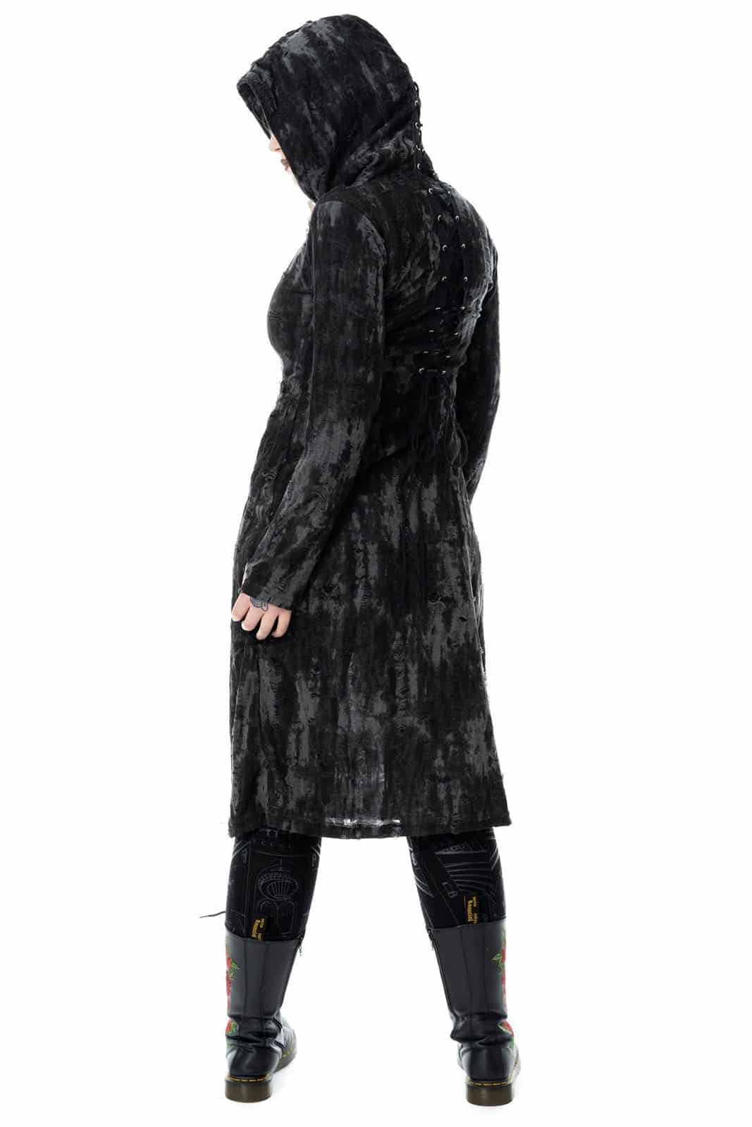 Dieser lange Cardigan im Used-Look verbindet düstere Eleganz mit markanter Struktur. Das schwarz-graue Muster wirkt wie verwittert und verleiht dem Design eine geheimnisvolle Tiefe. Die Kapuze und die dekorative Schnürung im Rücken setzen starke Gothic-Akzente, während der taillierte Schnitt eine schlanke Silhouette betont. Ein außergewöhnliches Layering-Piece für Darkwear- und Gothic-Outfits.