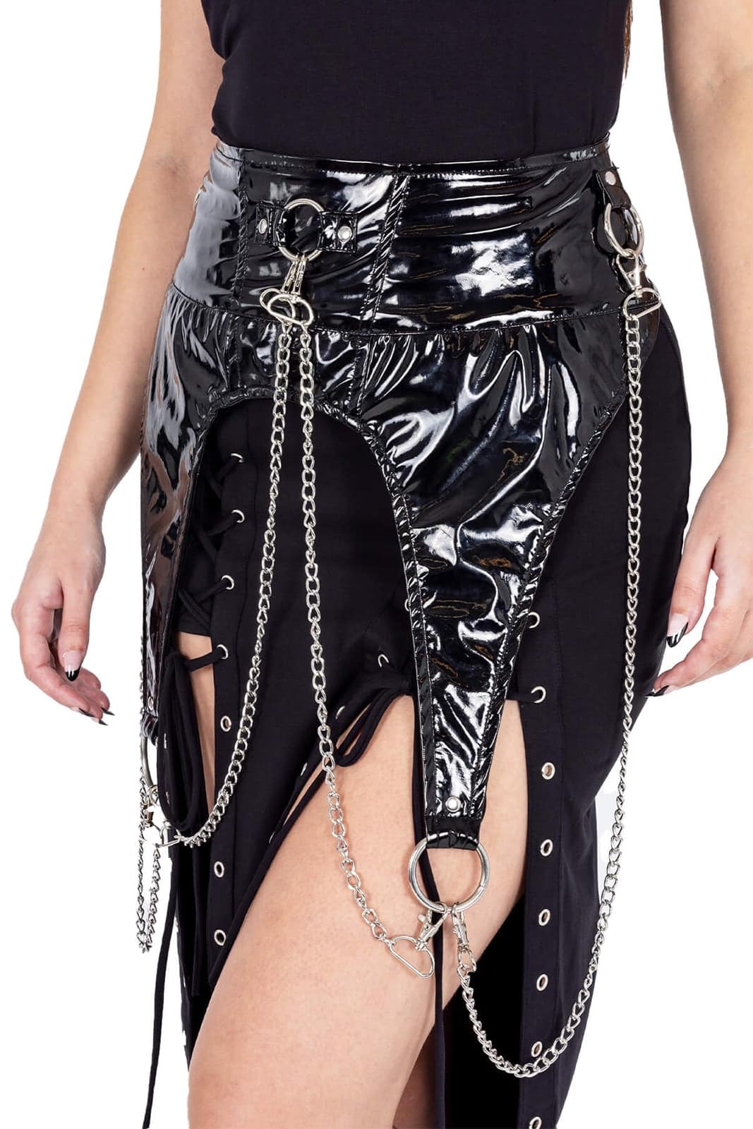 Hoch glänzender Gürtel aus Lackmaterial verziert mit silbernen Ketten. Im Rücken mit einer Schnalle zu schließen.