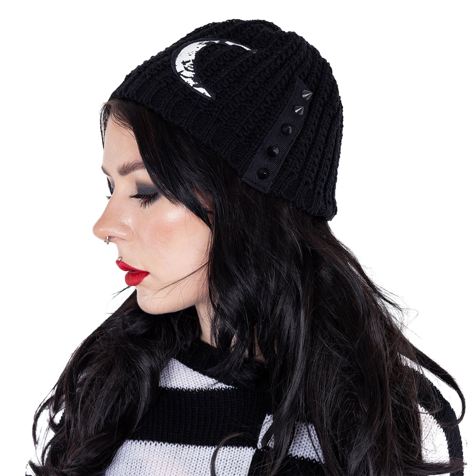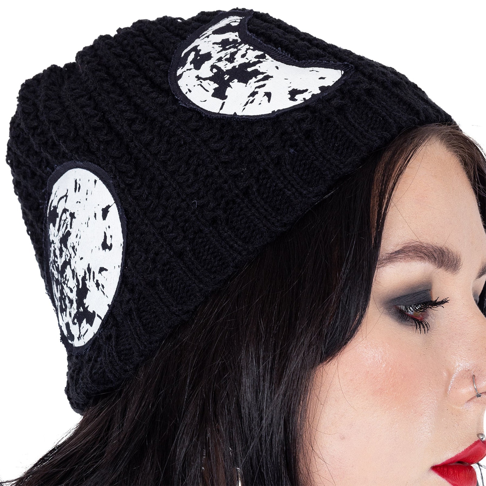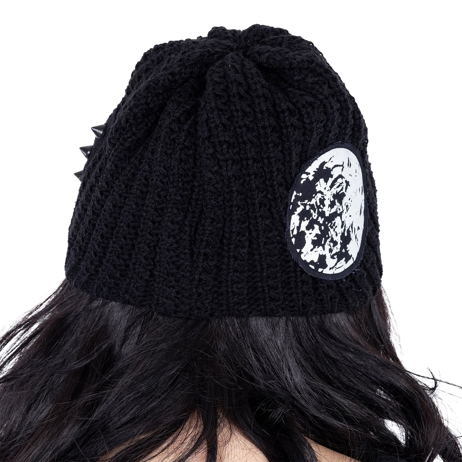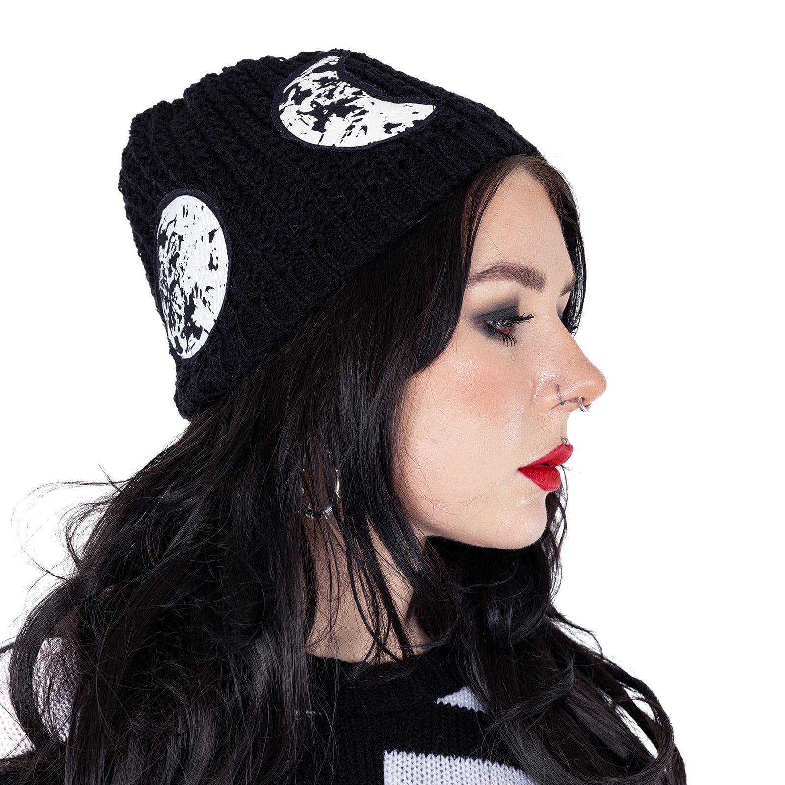 Diese auffällige Beanie verbindet handwerklich wirkende Strickoptik mit markanter Dark-Ästhetik. Die grob gestrickte schwarze Mütze wird durch kontrastreiche, aufgenähte Mondpatches zu einem starken Statement-Piece, das Mystik, Nacht und Alternative Fashion perfekt miteinander vereint. Kleine Nieten-Details am Hinterkopf setzen zusätzliche Akzente und verleihen dem Design eine subtile, rebellische Note.