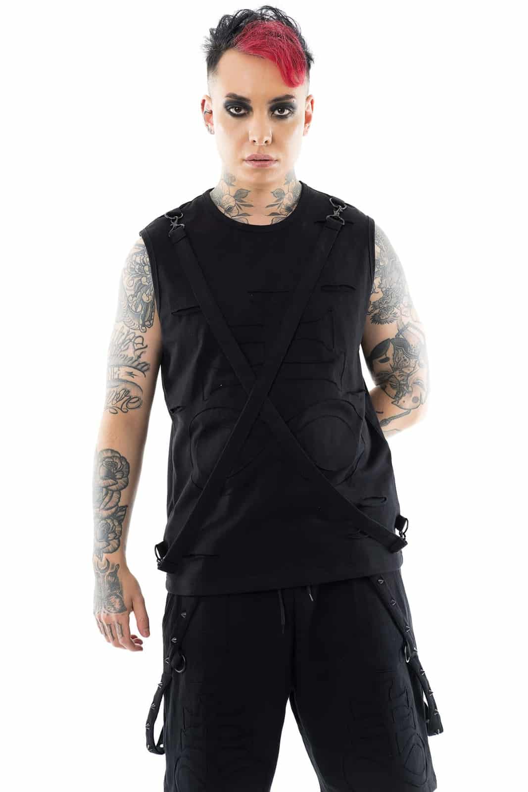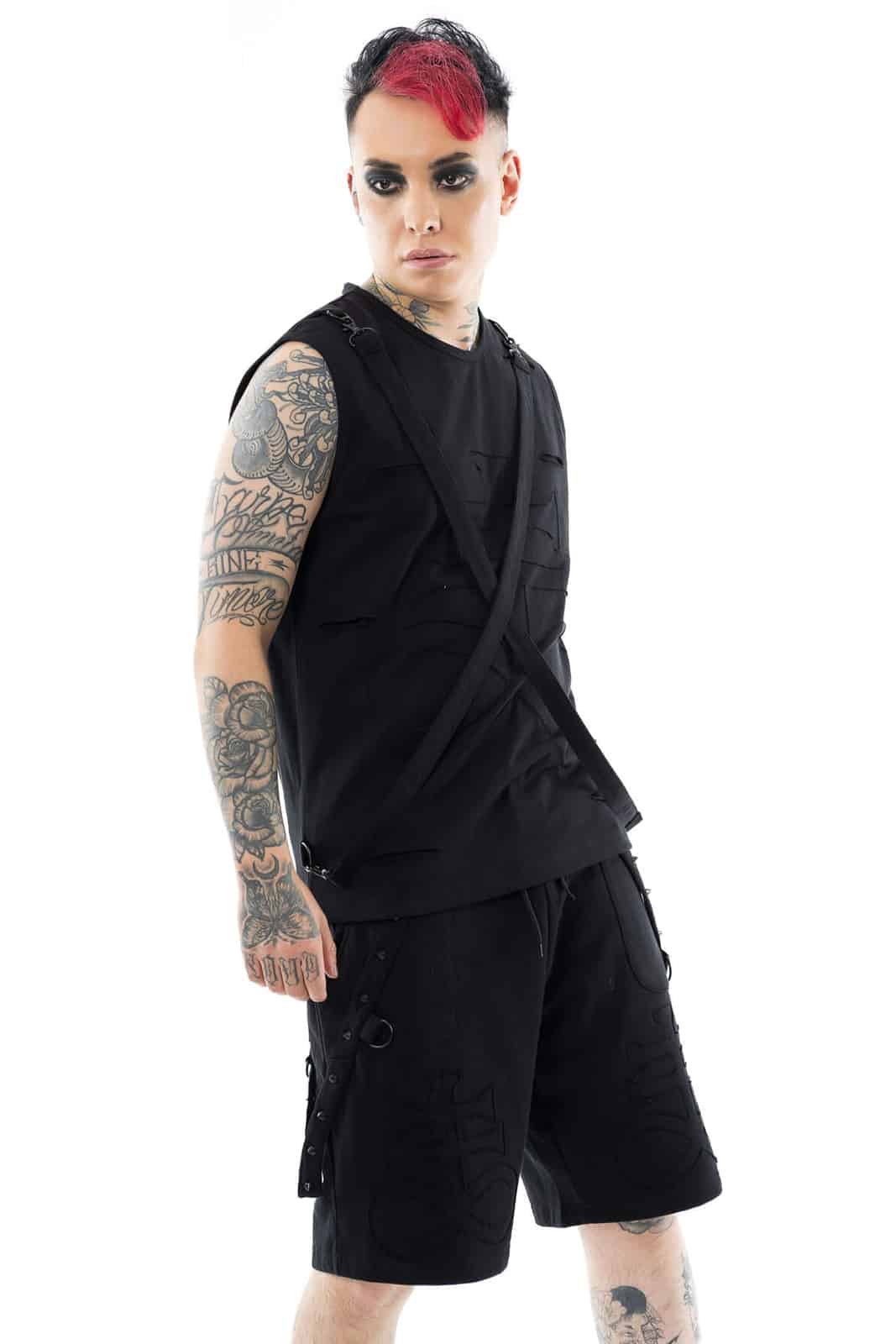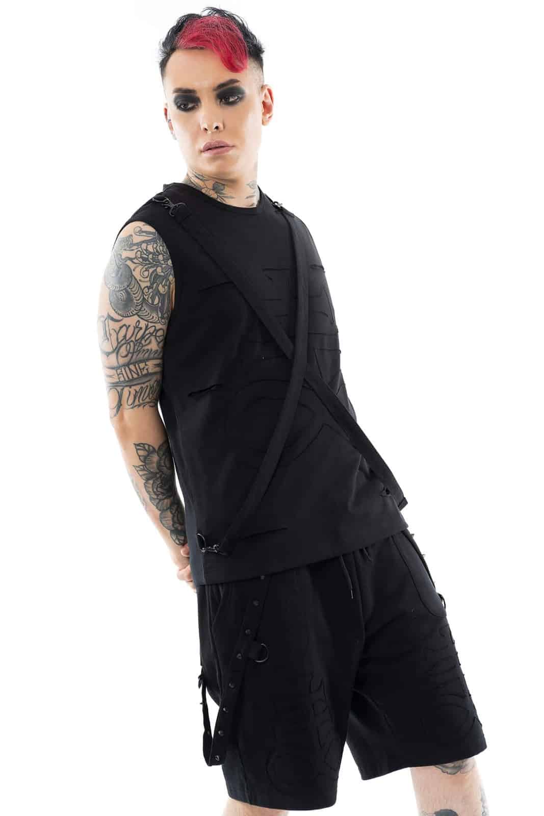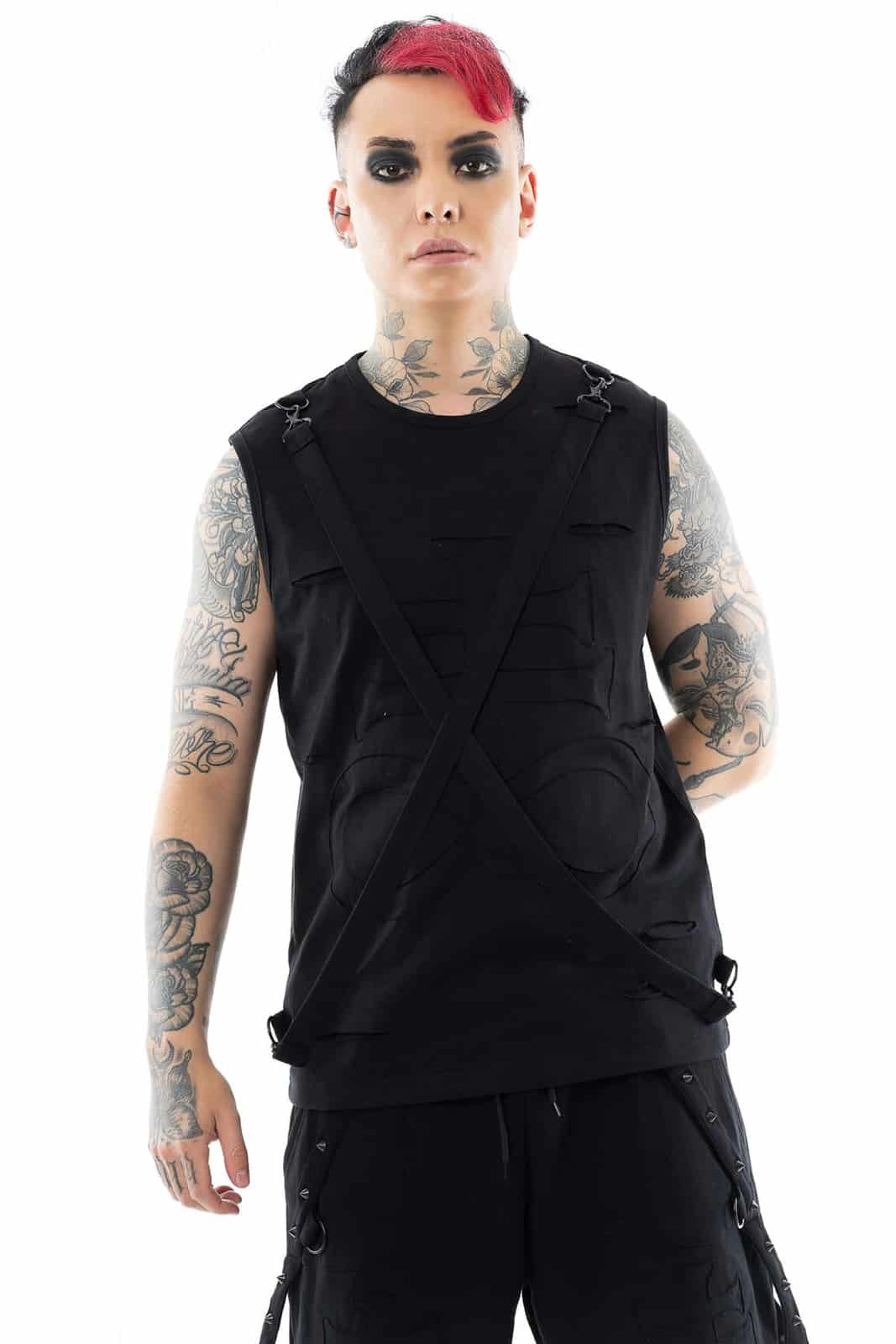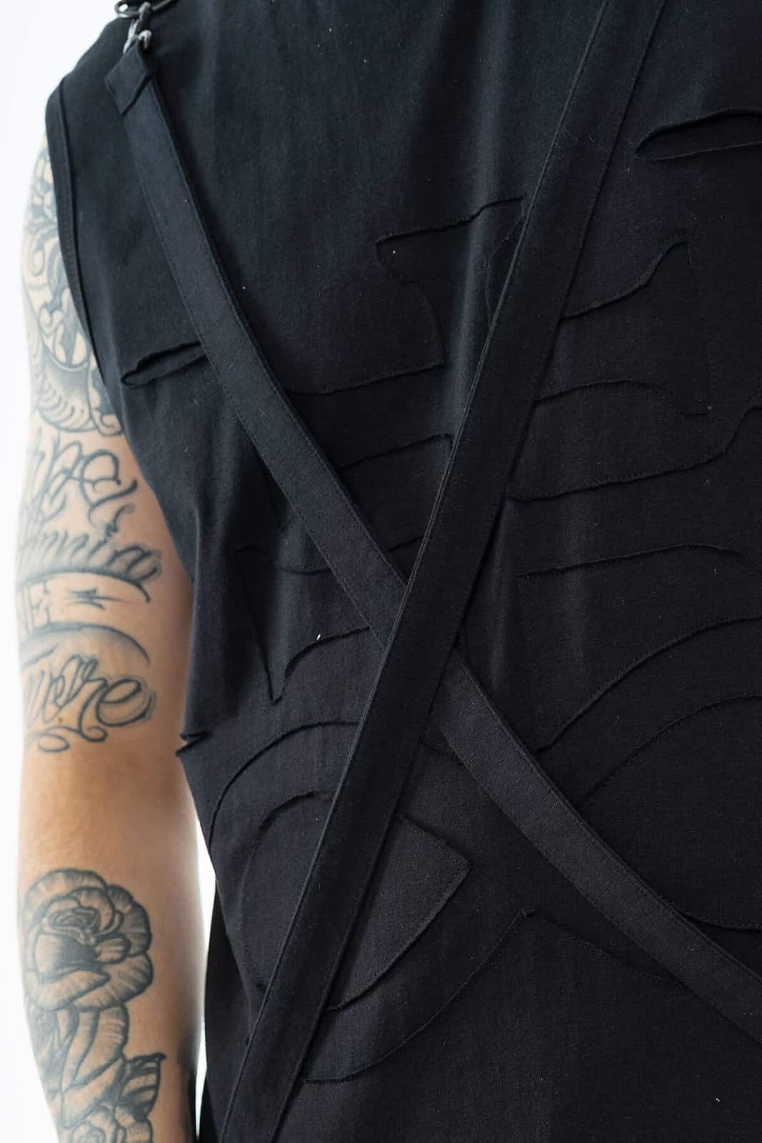 Dieses schwarze ärmellose Shirt bringt mit seiner strukturierten Front und den überkreuzten Gurten eine klare Industrial-Note ins Spiel. Die applizierten Cut-Out-Elemente erzeugen einen dezenten 3D-Effekt und geben dem Design zusätzliche Tiefe. Verstellbare Träger mit Karabinerverschluss lassen sich individuell anpassen und verleihen dem Shirt einen harness-inspirierten Touch. Gefertigt aus einem weichen, elastischen Baumwoll-Elasthan-Mix sitzt das Shirt bequem und körpernah – perfekt für Layering, Sommer-Looks oder Club-Outfits mit Statement-Faktor. Die Rückseite ist schlicht gehalten und lenkt den Fokus voll auf das aufwendig gestaltete Frontpanel.