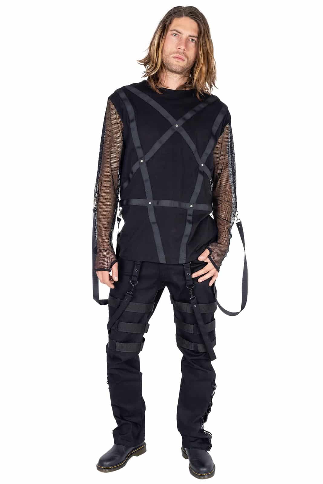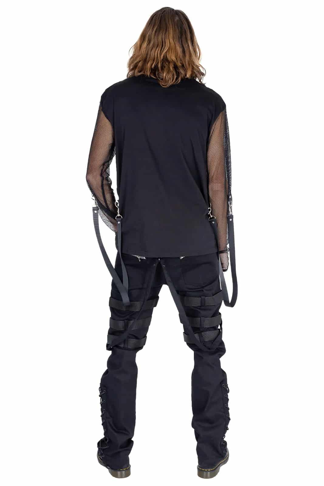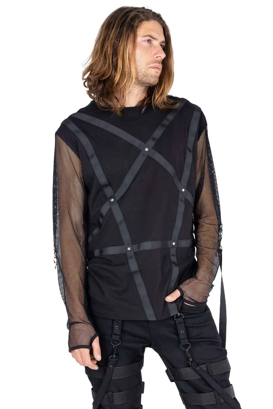 Herrenshirt aus einer weichen Baumwollmischung mit aufgenähten Bändern auf der Vorderseite und Ärmeln aus transparentem Netzmaterial mit Daumenloch. Abnehmbare Riemen verlaufen vom Ellbogen zur Taille und sind an D-Ringen befestigt.