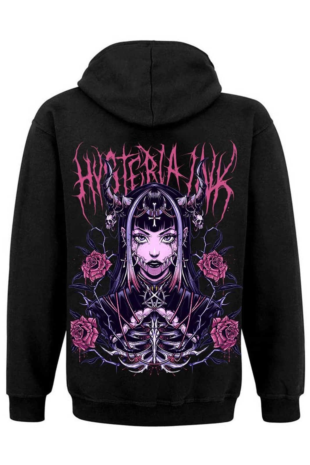 Gothic Kapuzenpullover mit großflächigem Rückenprint im Occult Style. Aus reiner Baumwolle, mit Kapuze, durchgehendem Frontreißverschluss und zwei Seitentaschen. Unisex.