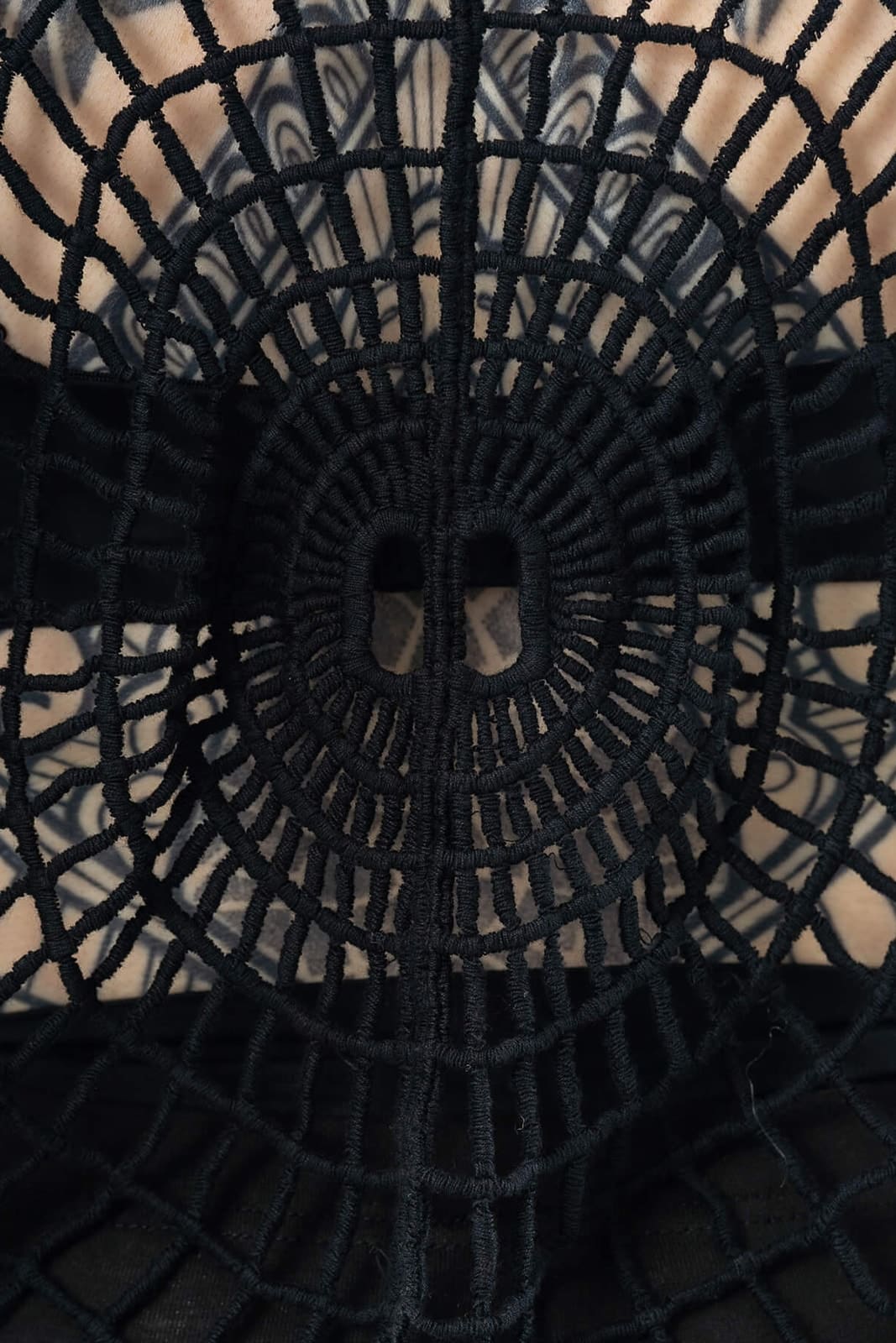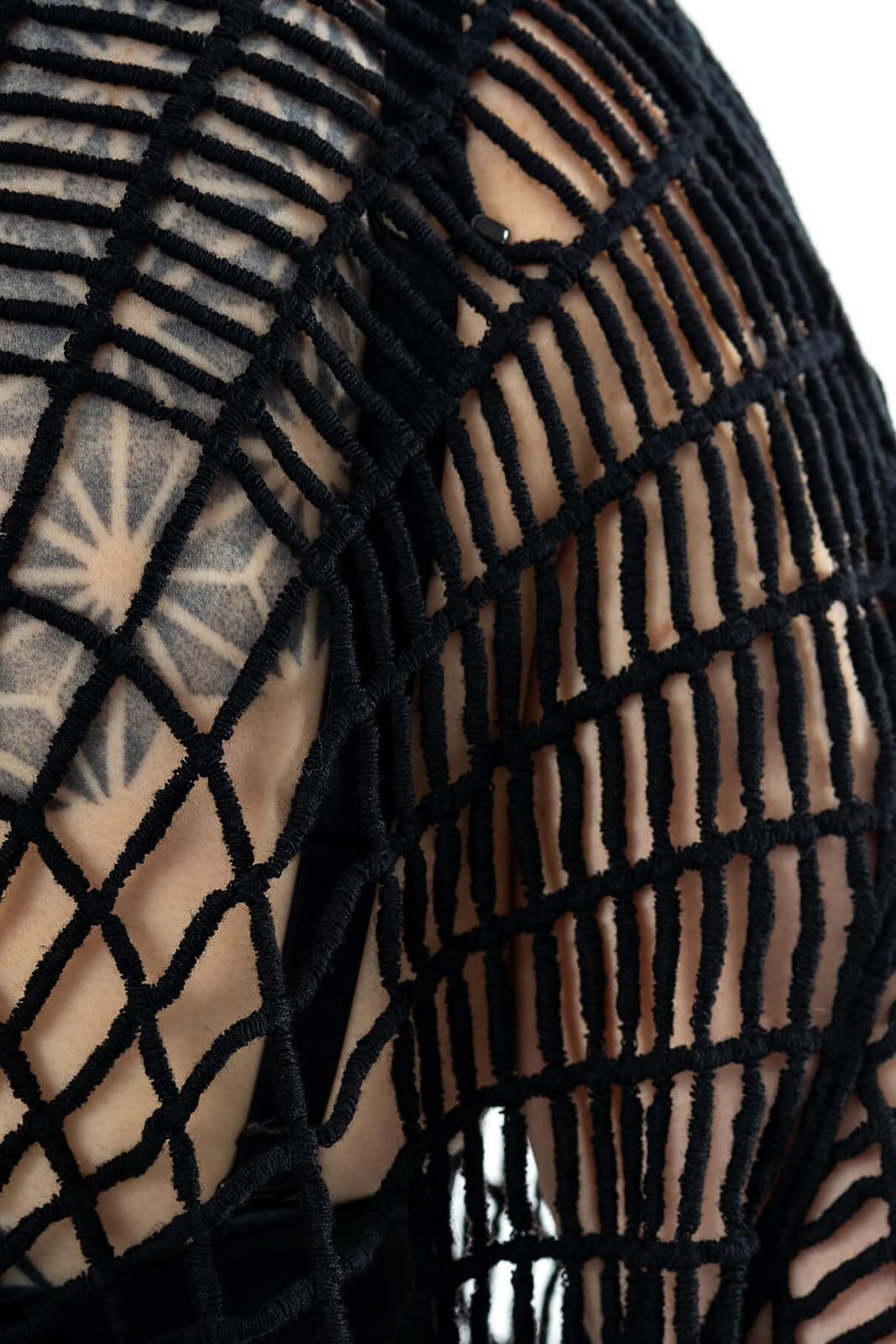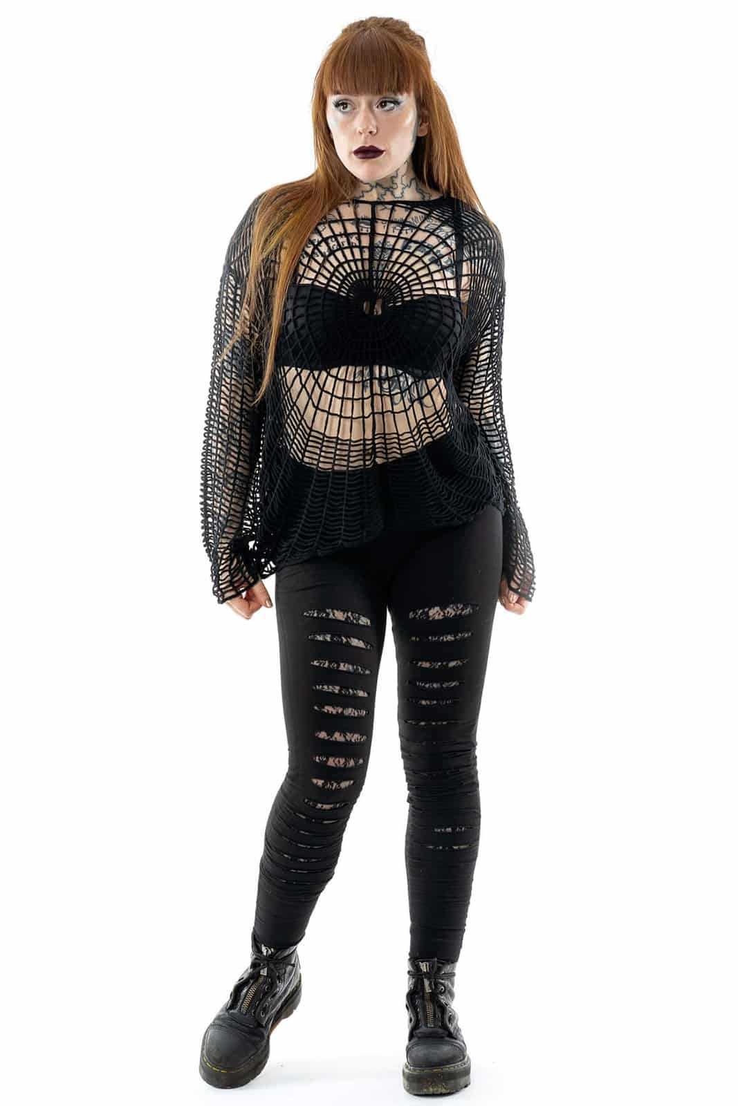 Dieses ausgefallene Longsleeve im Spinnennetz-Look setzt starke Akzente und verleiht jedem Outfit eine düstere, avantgardistische Note. Die handgefertigt wirkende Netzstruktur aus reiner Baumwolle schmiegt sich locker um den Körper und bietet durch das weitmaschige Design viel Bewegungsfreiheit und einen luftigen Tragekomfort. Der kreisförmige Mittelpunkt auf Brust und Rücken erzeugt einen hypnotischen Effekt und macht das Stück zu einem echten Eyecatcher – ob als Layer über Crop-Top, BH oder als Kontrast zu engen Silhouetten. Perfekt für Festivals, Clubnächte oder als Statement im Alltag.