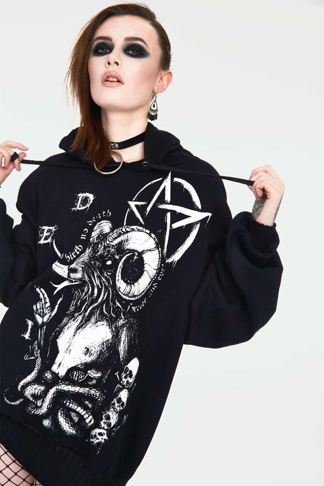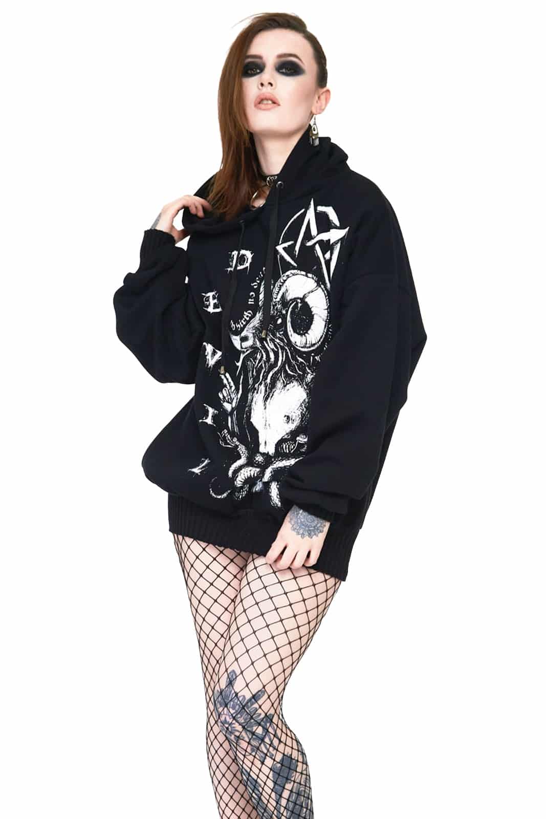 Dieser Oversize-Hoodie bringt mit seinem markanten Devil-Tarot-Motiv eine kraftvolle, düstere Ästhetik in deinen Look. Der großflächige Print kombiniert Teufelsikonografie mit Pentagrammen, Schädeln und Schlangen und erzeugt damit eine echte Dark-Art-Atmosphäre. Die weite Passform sorgt für einen lässigen, bequemen Sitz – perfekt für alle, die ein expressives Statement-Piece suchen.