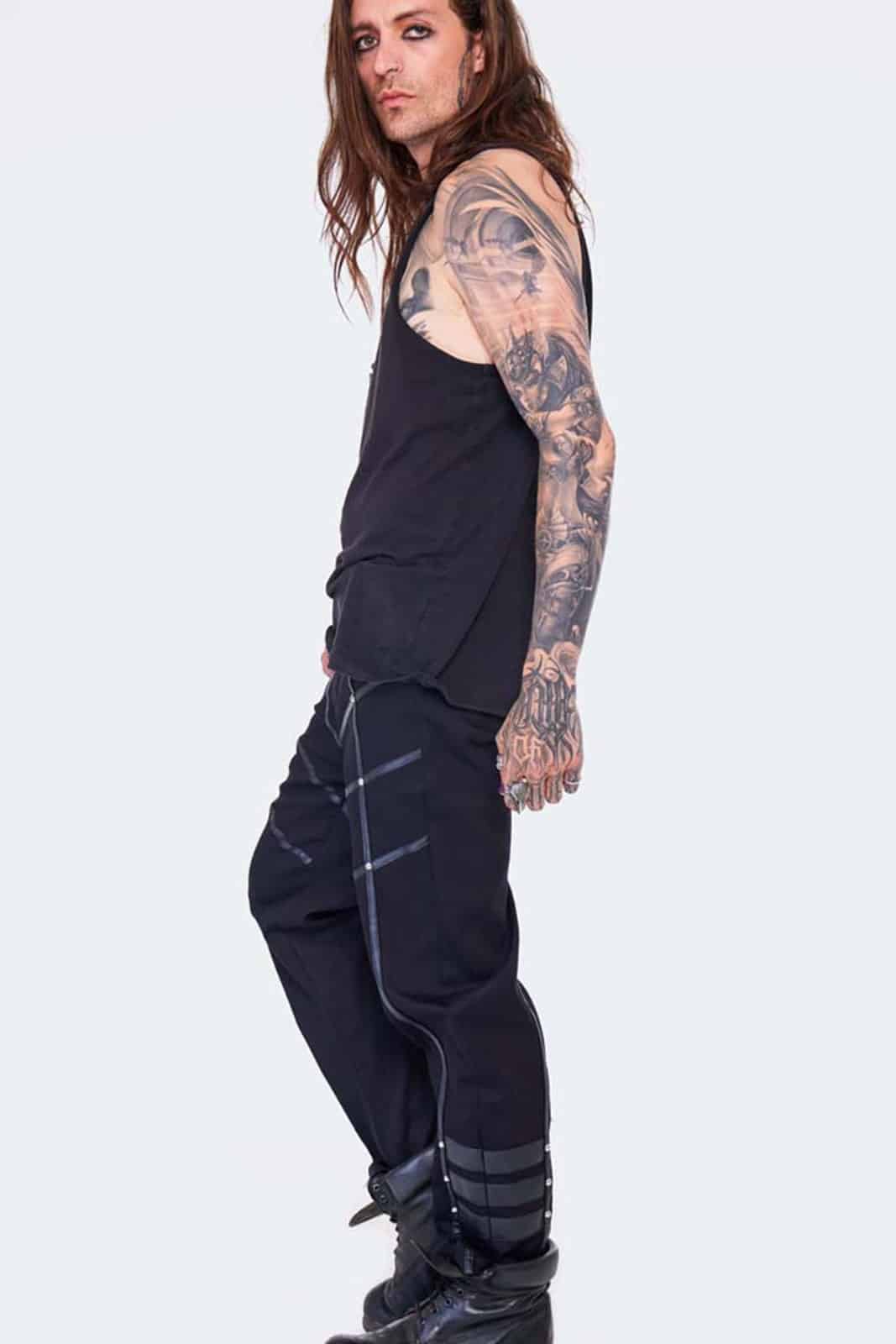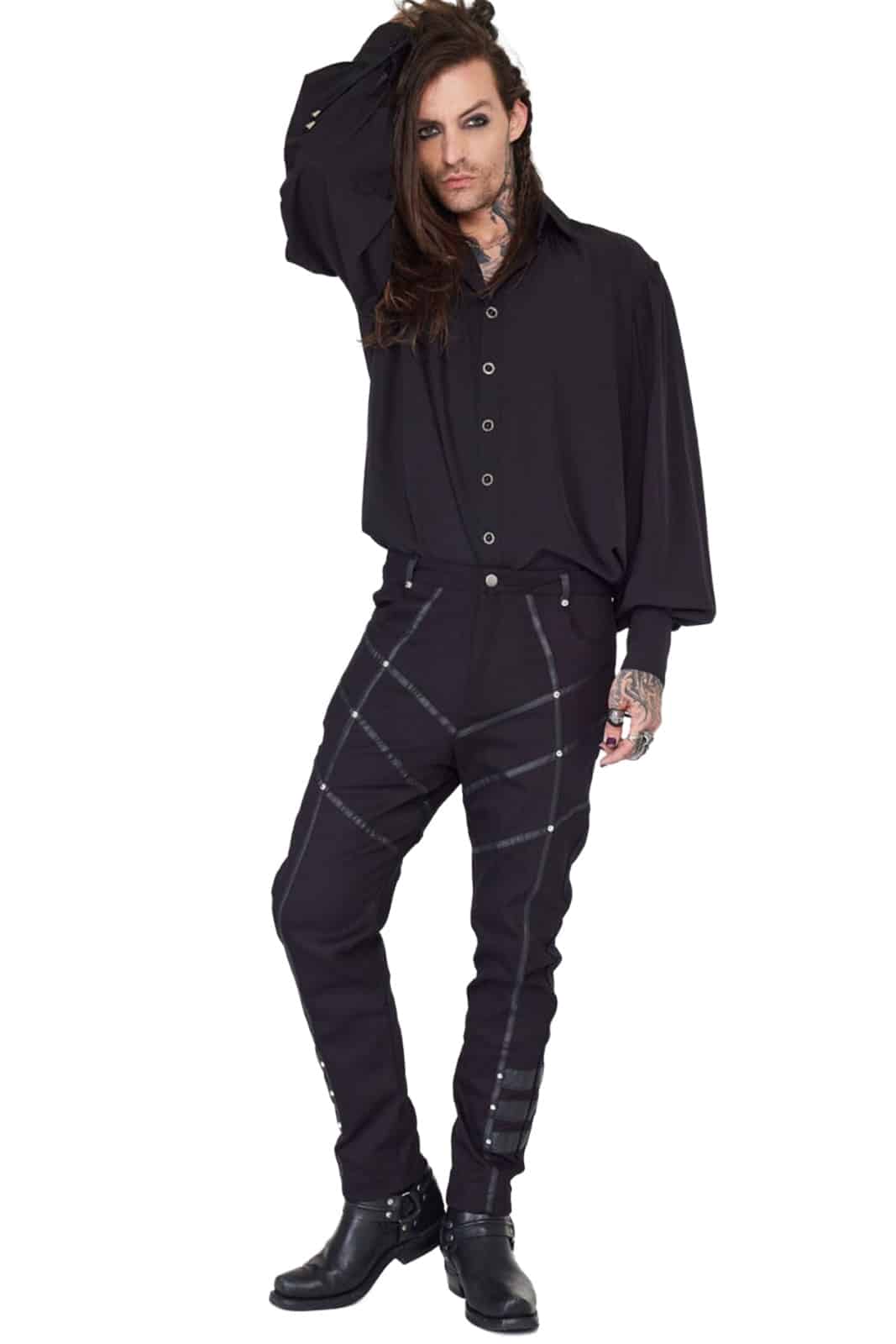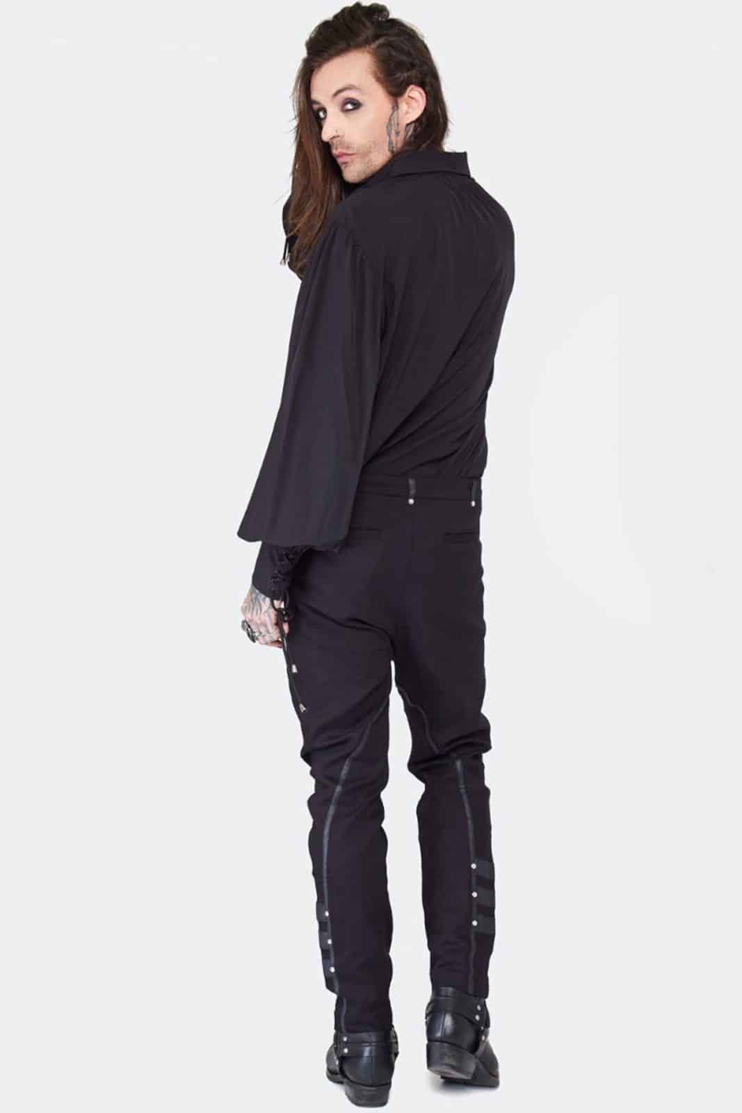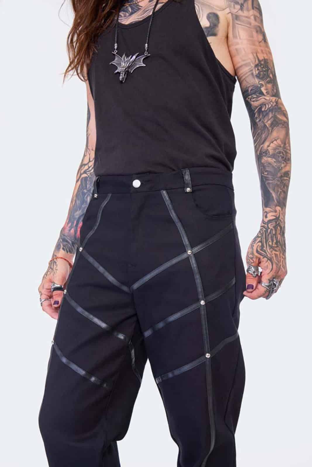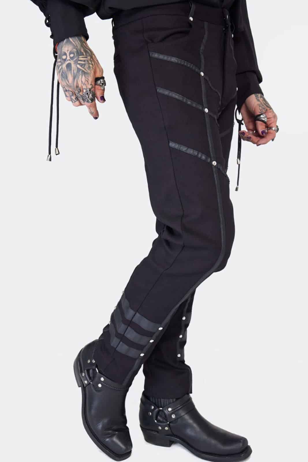 Gothic-Hose im Military-Stil aus einer dehnbaren Baumwollmischung mit Kontrastdetails aus Kunstleder. Verziert mit silbernen Nieten.