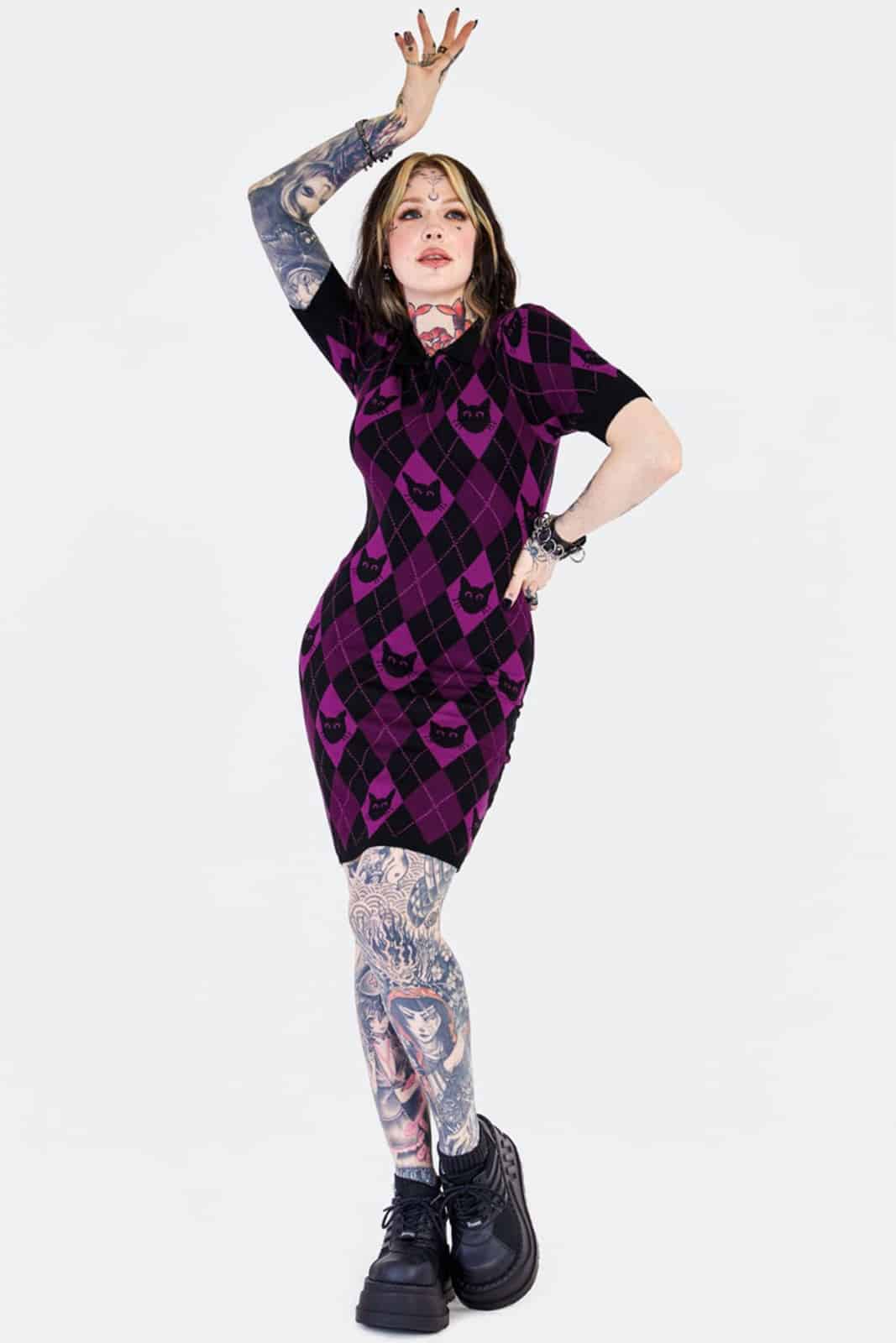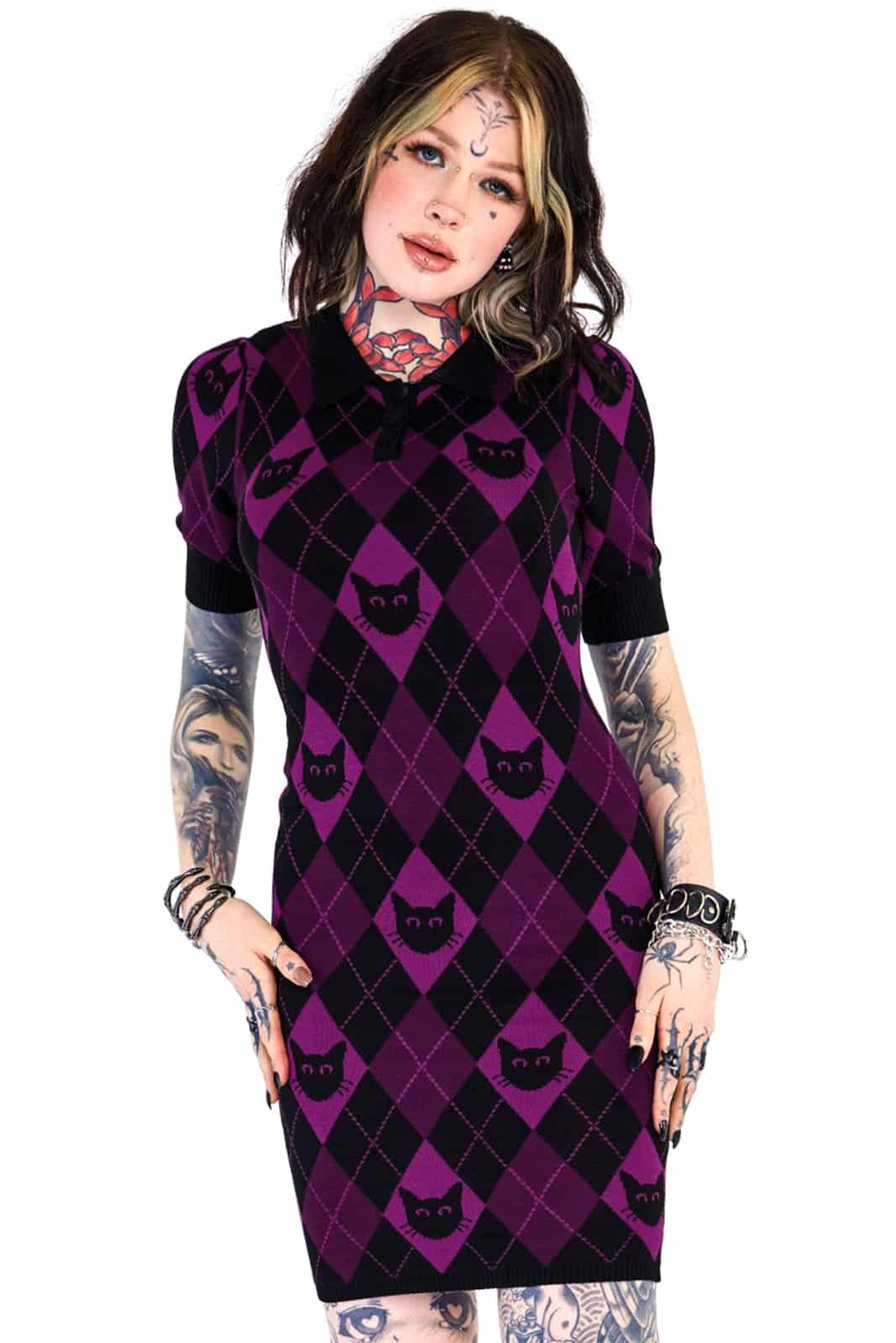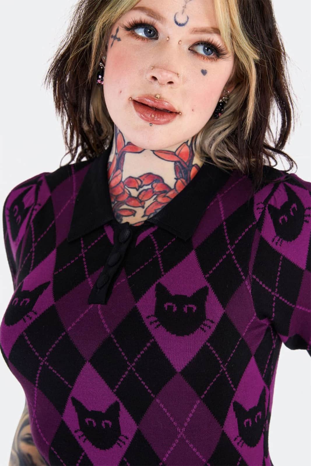 Dieses gestrickte Minikleid kombiniert ein klassisches Argyle-Muster mit einem verspielten Cat-Motiv und sorgt damit für einen perfekten Mix aus süß und düster. Der Polokragen mit Knopfleiste und die kurzen Ärmel geben dem Design eine sportlich-elegante Note, während das weiche, anschmiegsame Strickmaterial in Lila und Schwarz für hohen Tragekomfort sorgt.
