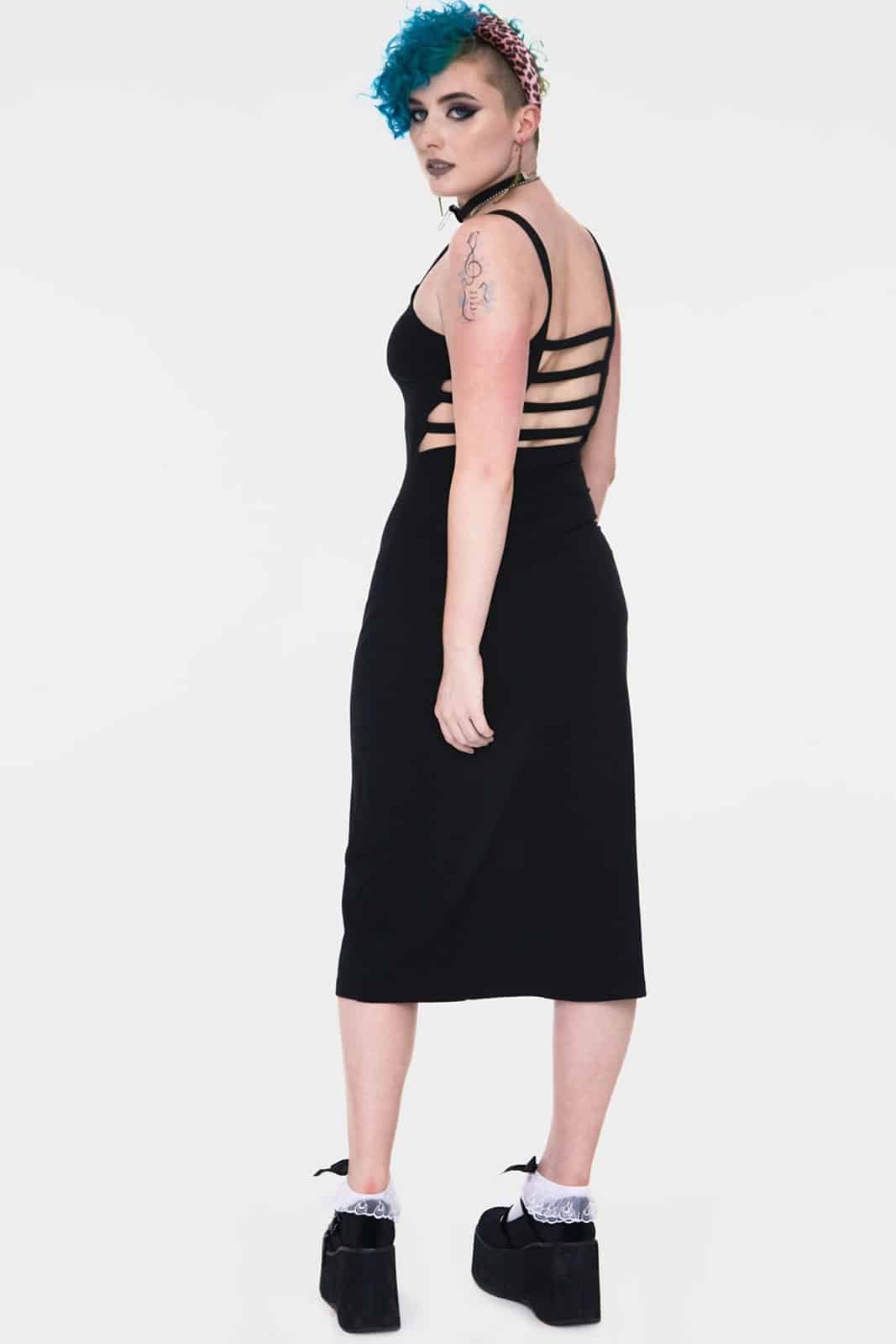Langes schwarzes Gothic-Kleid mit Trägern und geschlitztem Rücken. Die Vorderseite ist mit einem okkulten Aufdruck verziert. Dieser zeigt Schlangen, Monde und okkulte Symbole.