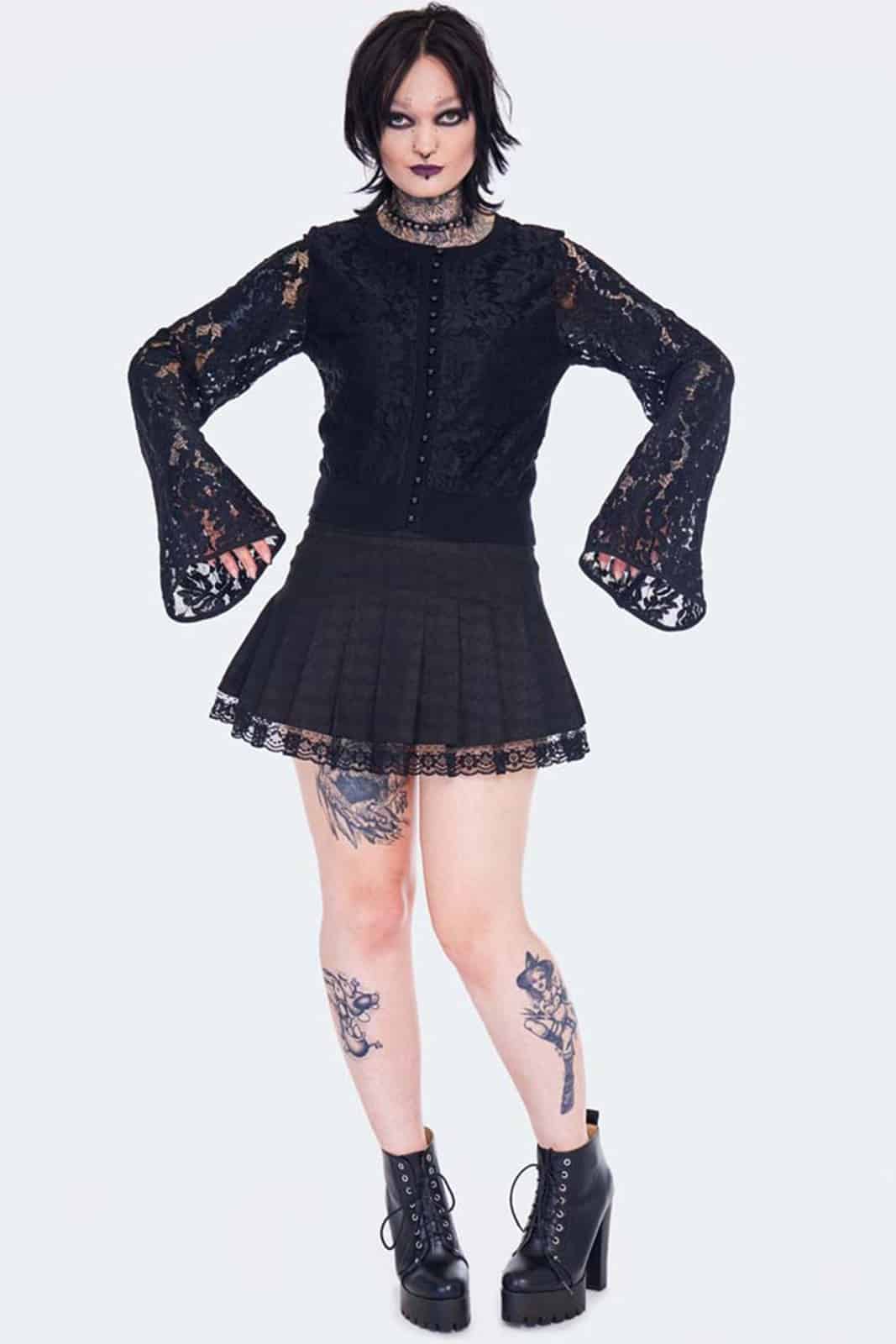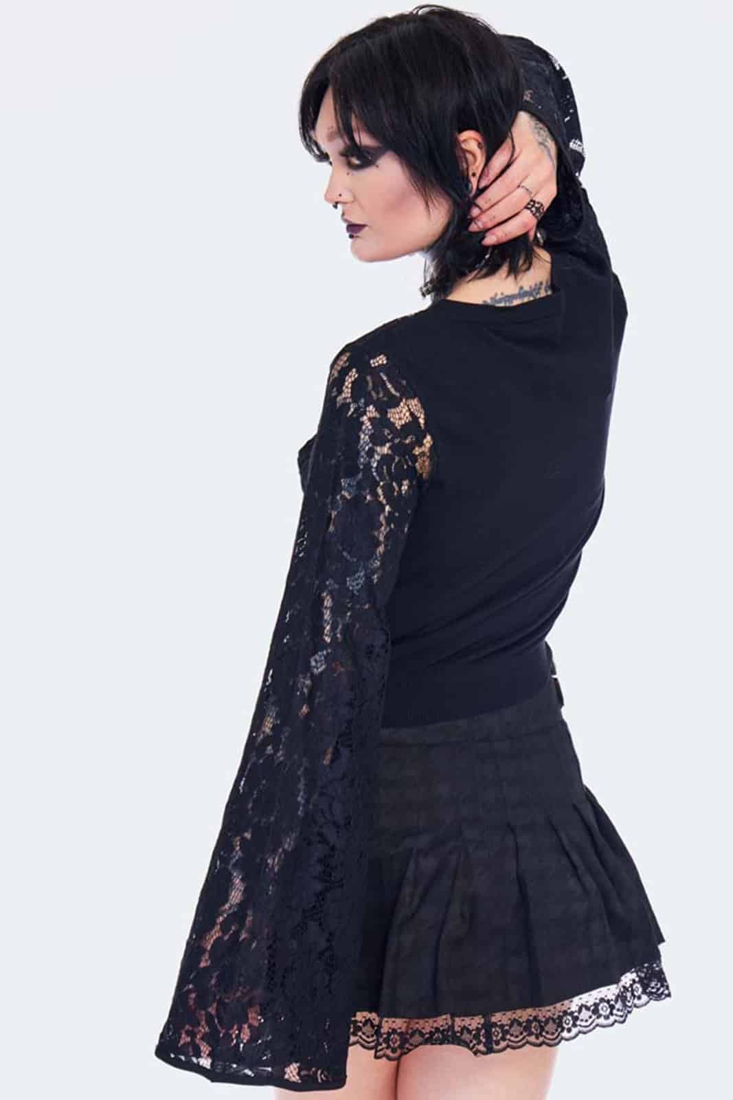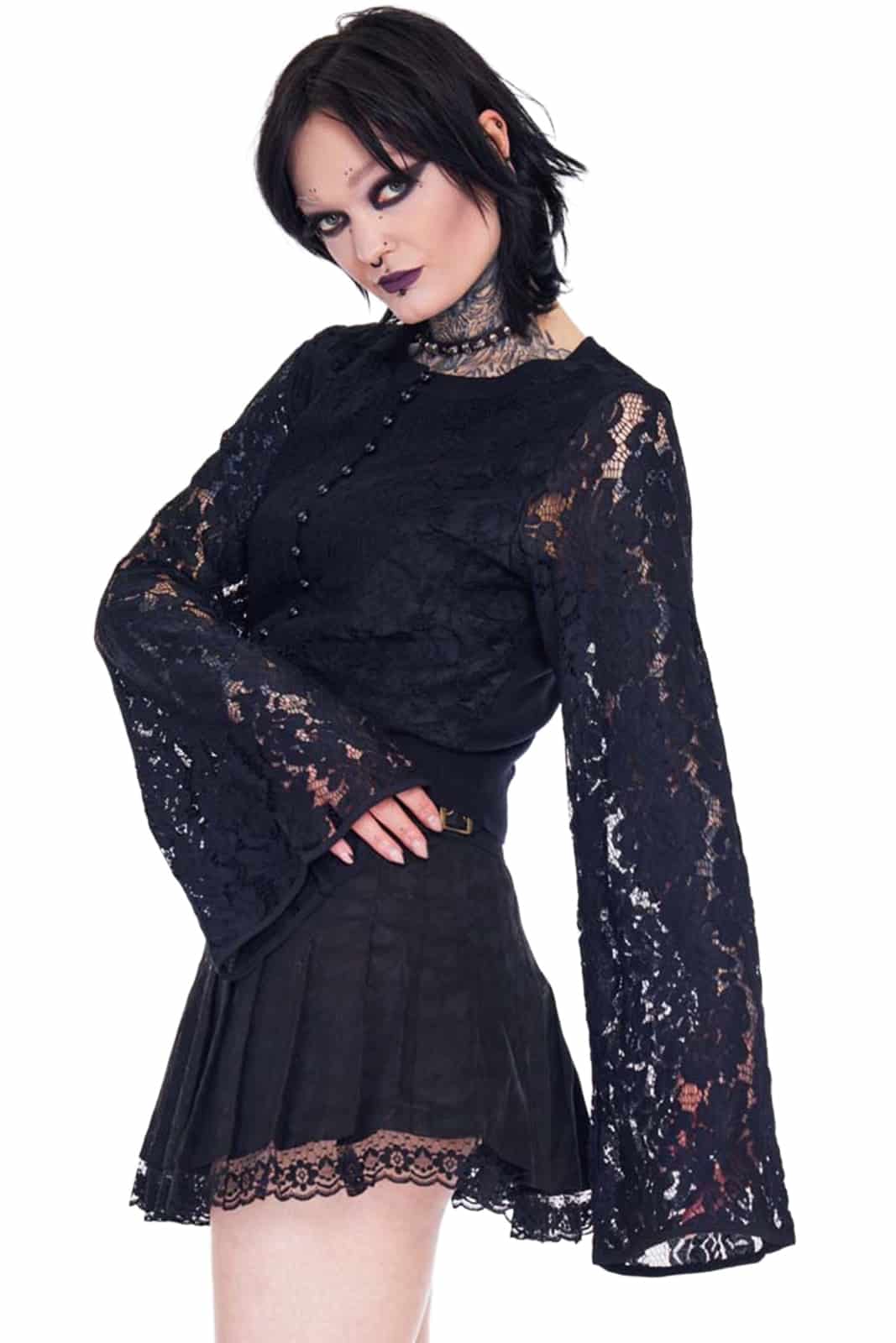 Diese schwarze Strickjacke vereint viktorianische Romantik mit düsterer Eleganz. Der figurbetonte Rumpf wird von weit ausgestellten Ärmeln aus floraler Spitze ergänzt, die bei jeder Bewegung an Flügel erinnern. Ein runder Ausschnitt und die durchgehende Knopfleiste verleihen dem Design eine klassische Silhouette, während die transparenten Ärmel für einen verführerischen Gothic-Twist sorgen. Ideal als stilvoller Begleiter über Tops oder Kleider – für alle, die auch bei Cardigans nicht auf Dramatik verzichten wollen.