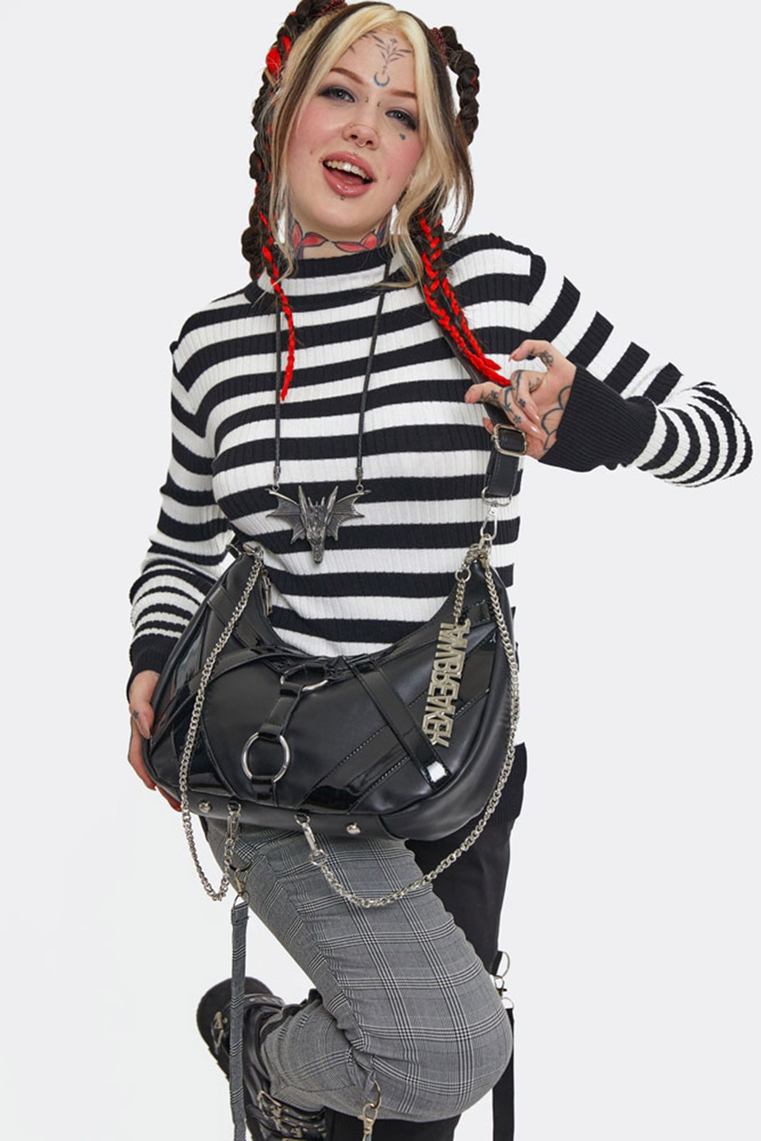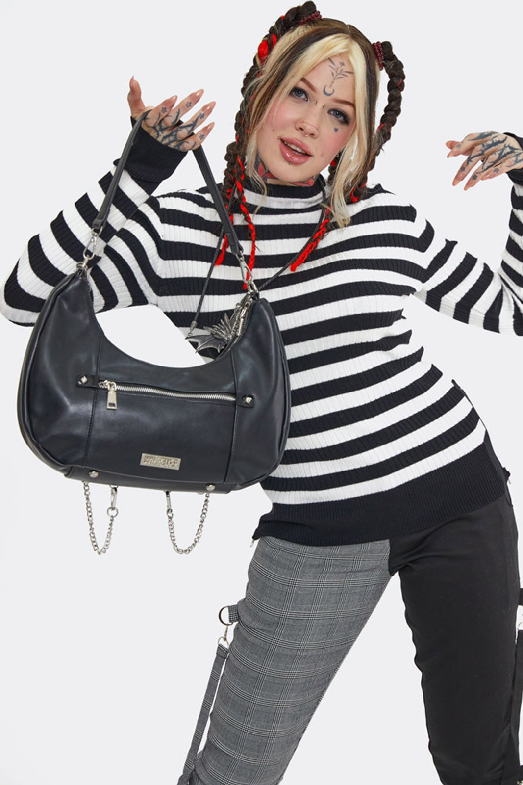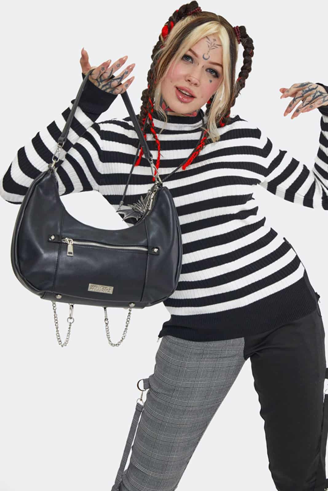Hobo-Tasche aus schwarzem Kunstleder im Gothic-Stil der 90er mit hängenden Ketten, PVC-Streifen und silbernen O-Ring-Details. Abnehmbare silberne Ketten und Leder sowie eine abnehmbare Jawbreaker-Metallplakette, die als Schlüsselanhänger dienen. Die Nieten unter dem Boden runden das Design ab. Zwei abnehmbare Riemen stehen zur Auswahl. Reißverschlusstaschen auf der Rückseite und innen sind ebenfalls vorhanden. Mit Staubschutzbeutel.