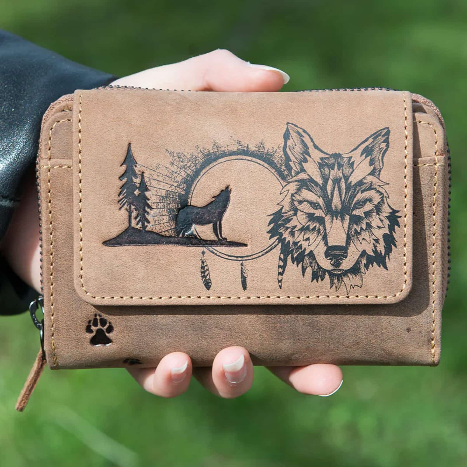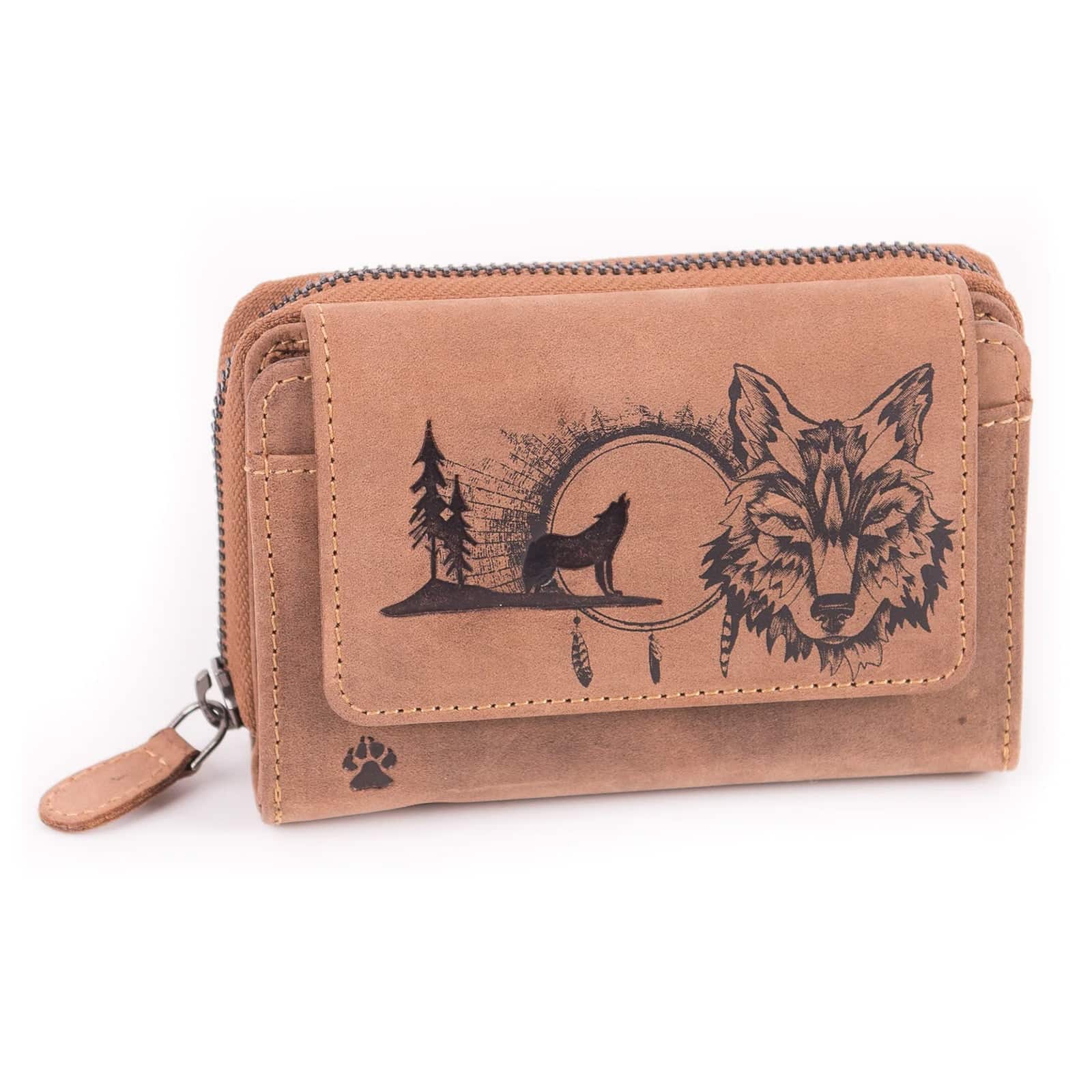 Kompakte Damengeldbörse mit Wolf-Motiv aus Büffelleder.