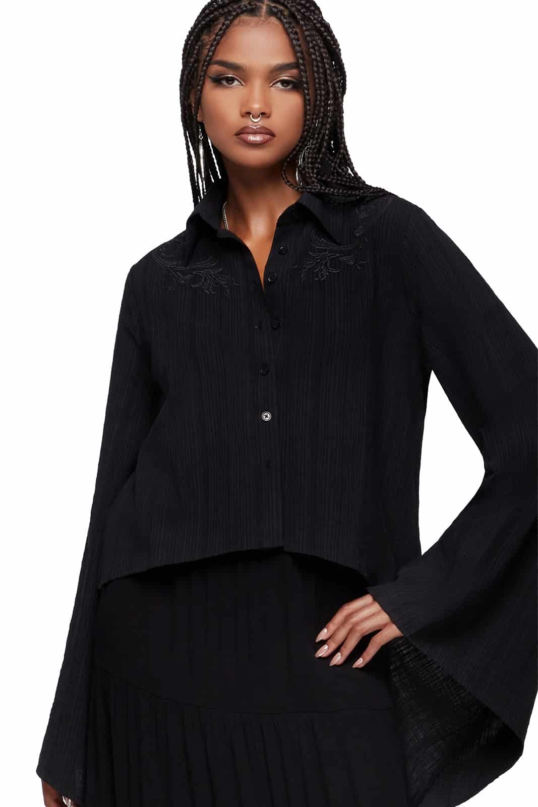 Diese außergewöhnliche Bluse verbindet fließende Leichtigkeit mit dunkler Eleganz. Der weich strukturierte Stoff und die feinen Stickereien an den Schultern verleihen dem Design eine mystische Ausstrahlung. Dramatische, asymmetrische Glockenärmel und der High-Low-Saum sorgen für eine besondere Silhouette, die sich perfekt für ausdrucksstarke Gothic-Looks und stilvolle Layering-Outfits eignet.
