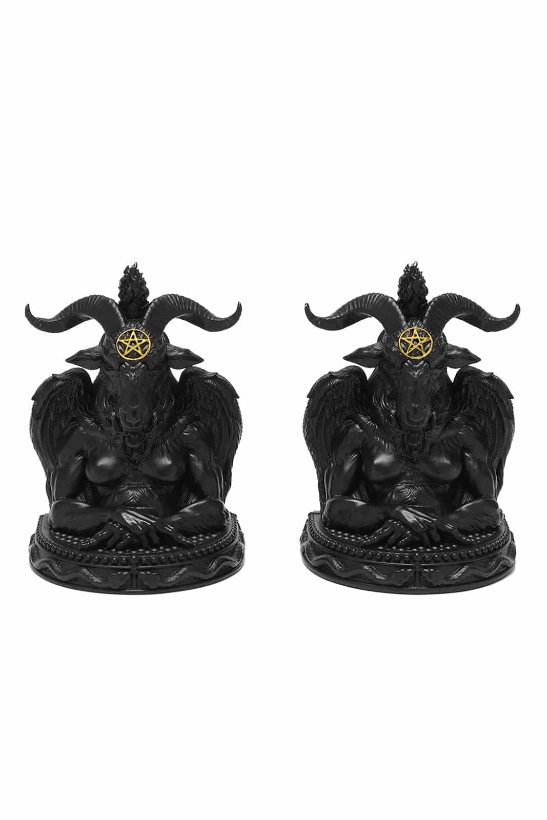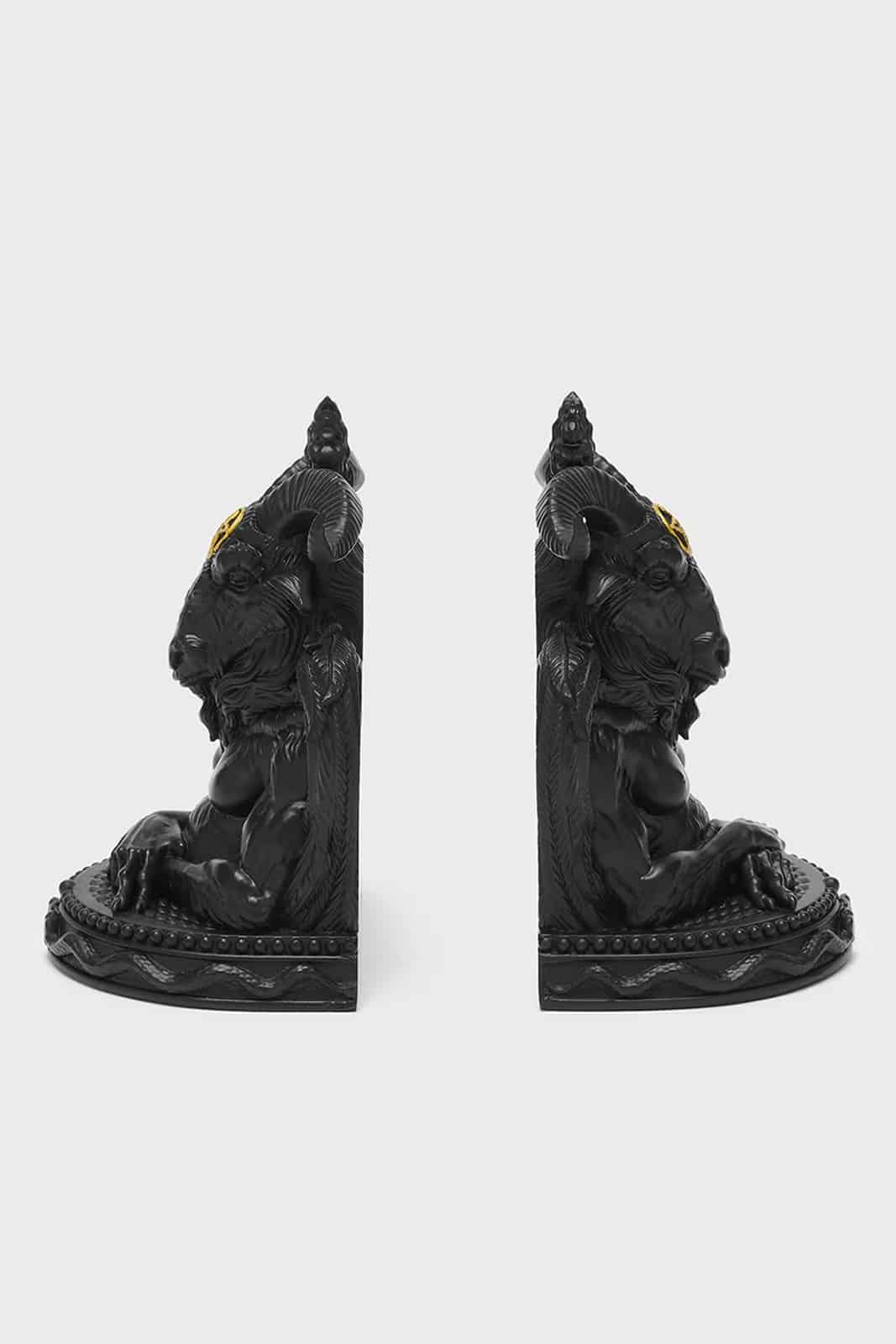 Gothic-Buchstützen im 2-er Set in Form von Baphomets mit goldenem Pentagram auf der Stirn in düsterem schwarz.