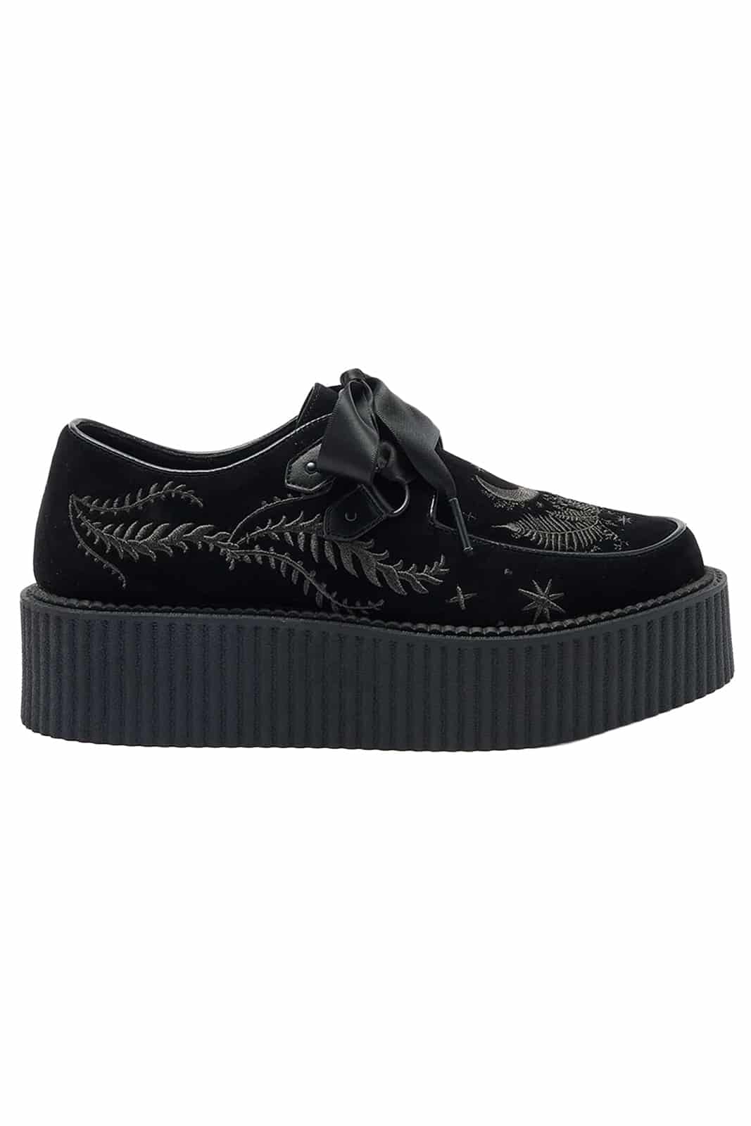 Diese Creeper verbinden klassischen Subkultur-Style mit okkultem Flair. Das weiche, gebürstete Samtmaterial wird durch detailreiche Stickereien mit Monden, Sternen und Blättern veredelt und macht die Schuhe zu einem echten Blickfang. Mit ihrer markanten Plateausohle bieten sie nicht nur Höhe, sondern auch Komfort, während das Satinband als Schnürung einen eleganten Akzent setzt. Perfekt für düstere Outfits und individuelle Looks.