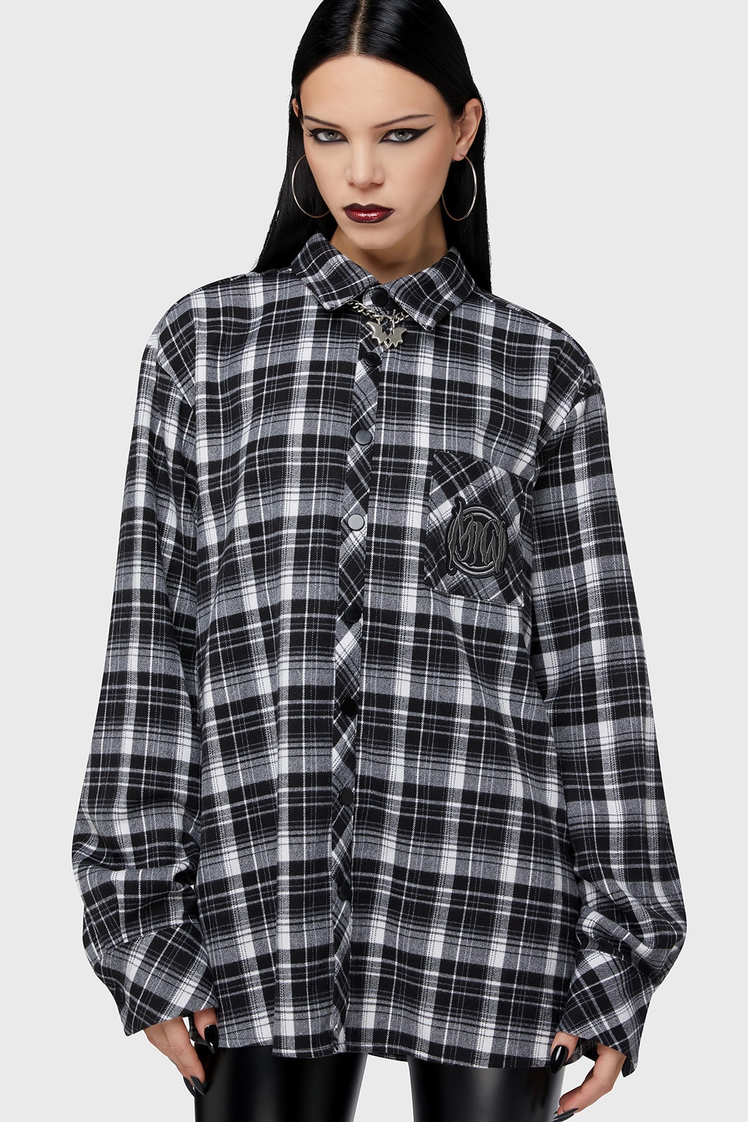 Dieses Flanellhemd aus der Motionless In White x KILLSTAR Kollaboration verbindet klassischen Grunge mit moderner Darkwear-Ästhetik. Der weich gewebte Flanellstoff trägt sich angenehm und sorgt für einen lässigen Fall, während das dezente MIW-Applikationspatch auf der Brust und das großflächige Canvas-Backpatch ein starkes visuelles Statement setzen. Ein vielseitiges Piece, das sowohl offen getragen als auch geschlossen überzeugt – perfekt für Layering-Looks mit Charakter.
