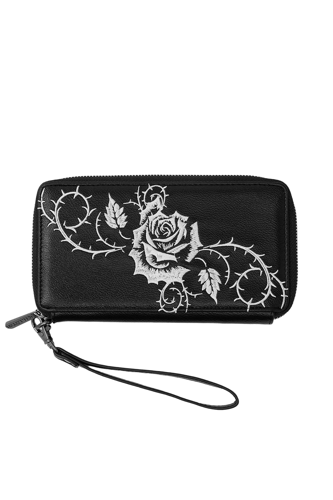 Diese elegante Geldbörse verbindet romantische Gothic-Ästhetik mit alltagstauglicher Funktionalität. Das fein strukturierte Kunstleder wird von einer aufwendig gestickten Rosen- und Dornenstickerei veredelt und macht das Design zu einem stilvollen Statement für jeden Tag.