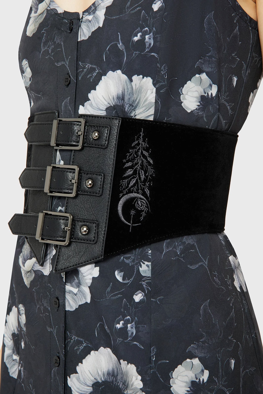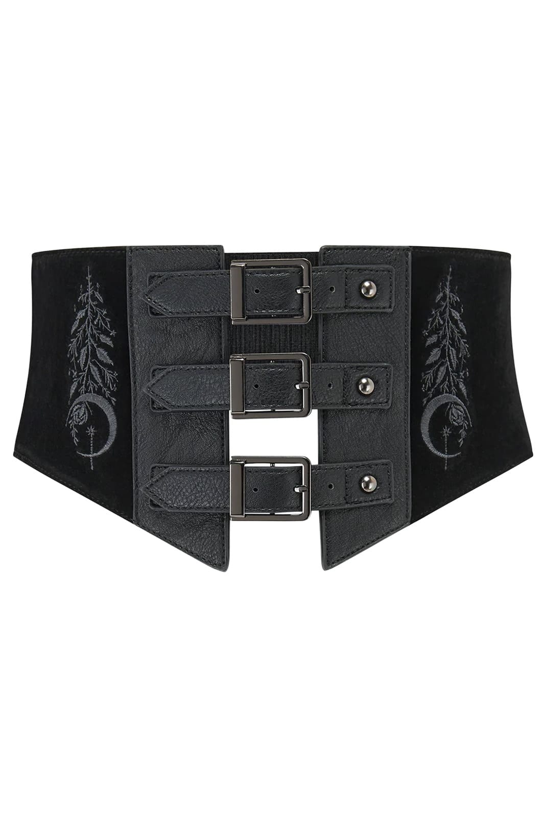 Ein mystischer Taillengürtel, der Eleganz und okkulte Symbolik vereint. Die samtigen Flächen treffen auf starkes PU-Material, während filigrane Stickereien von Monden und Zweigen geheimnisvolle Energie ausstrahlen. Mit seinen verstellbaren Frontschnallen und dem elastischen Einsatz bietet er eine perfekte Passform und verwandelt jedes Outfit in ein düsteres Statement.