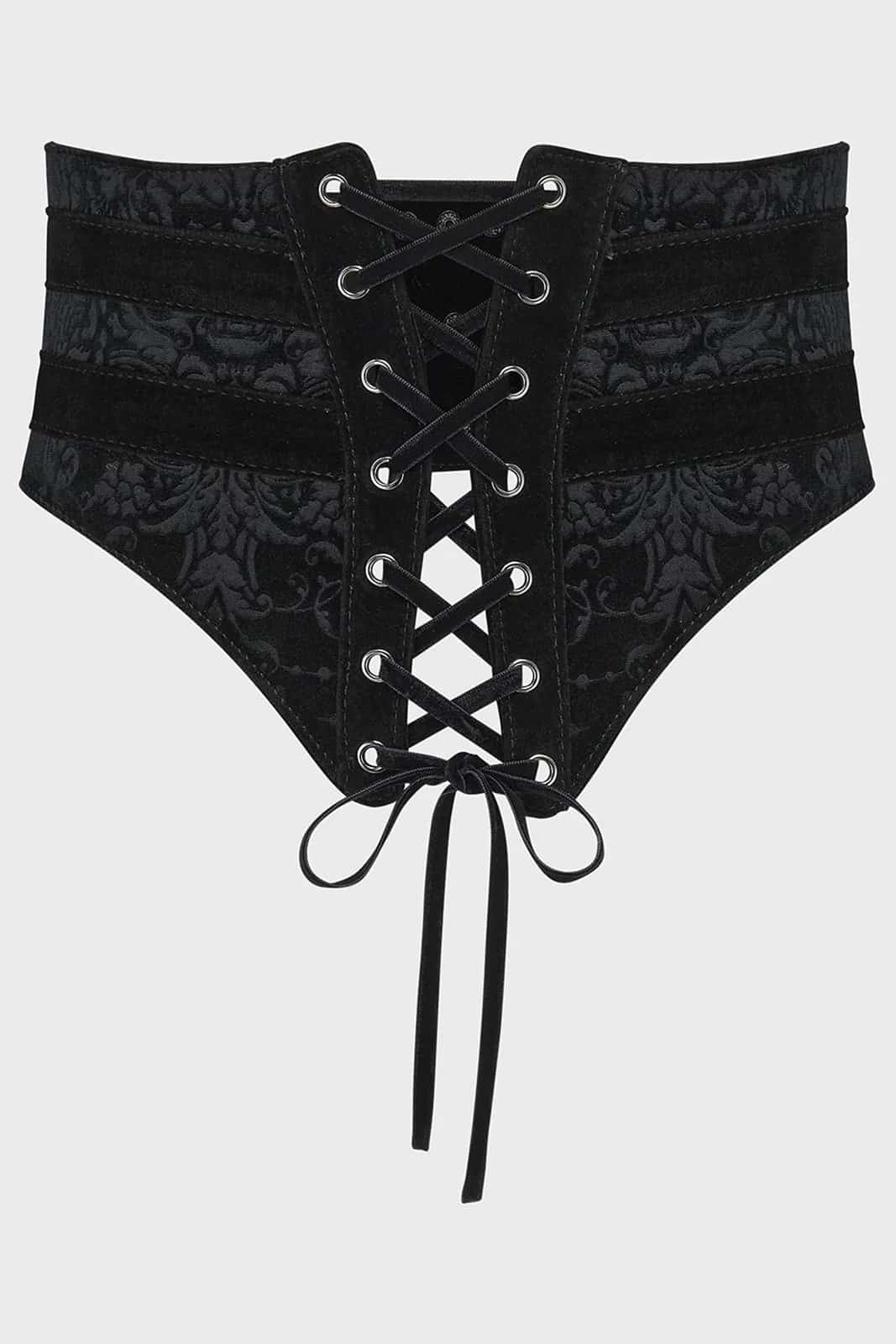 Dieser KILLSTAR Taillengürtel kombiniert edles Design mit markantem Gothic-Flair. Gefertigt aus weichem, geprägtem Samt im charakteristischen Fiend-Print, setzt er mit seiner geformten Front und der Schnürung mit Metallösen sowie doppelseitigem Samtband ein eindrucksvolles Statement. Die elastischen Rückenteile mit Druckknopfverschluss sorgen für optimalen Halt und hohen Tragekomfort. Ein stilvolles Accessoire, das Outfits sofort mehr Struktur und Eleganz verleiht.