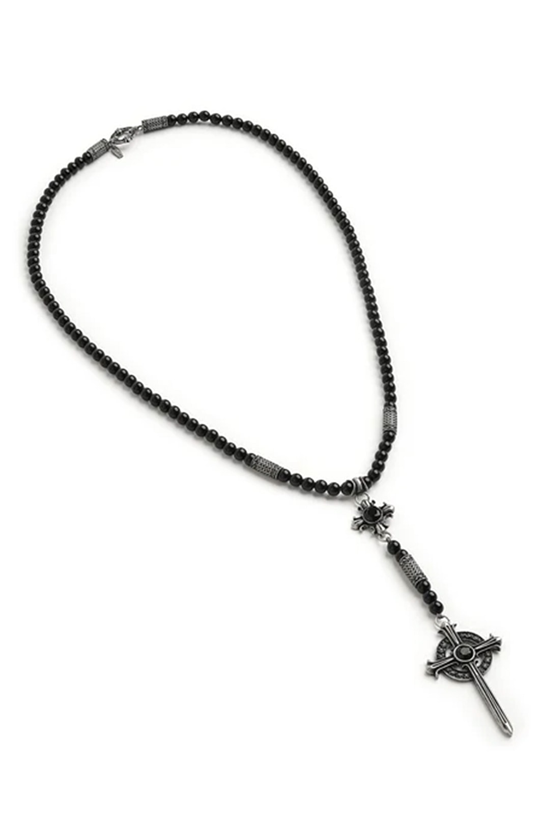 Eine ausdrucksstarke Rosenkranz-Halskette mit dunkler Perlenoptik und markantem Kreuzanhänger in Metall. Filigrane Details und ein dekoratives Element oberhalb des Kreuzes verleihen dem Schmuckstück eine geheimnisvolle, sakrale Ästhetik – perfekt als Statement zu schlichten Outfits oder als Ergänzung zu romantisch-düsteren Looks. Teil der Belladonna Linie, inspiriert von zeitloser Gothic-Romantik und dramatischen Silhouetten.