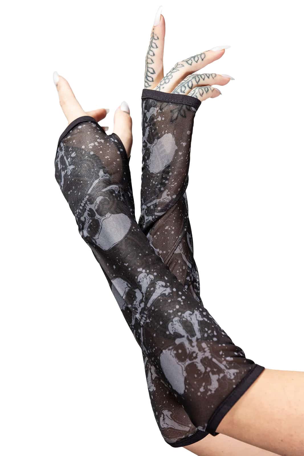 Fingerlose Handschuhe aus weichem, elastischem Material mit Daumenloch und All-Over-Skull-Print.