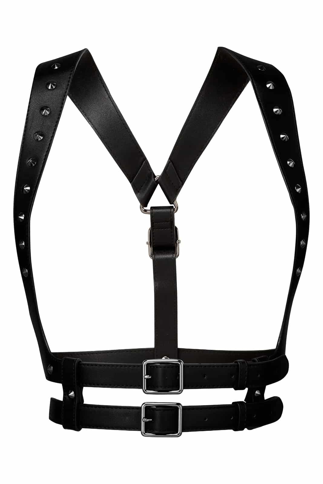 Dieses Harness aus Kunstleder ist ein markantes Accessoire für ausdrucksstarke Gothic- und Alternative-Looks. Mit den Nieten-Details und den verstellbaren Schnallen setzt es ein klares Statement und lässt sich individuell anpassen. Ob über Tops, Kleider oder als Hingucker bei Club-Outfits – dieses Stück verleiht jedem Style eine extra Portion Attitüde.