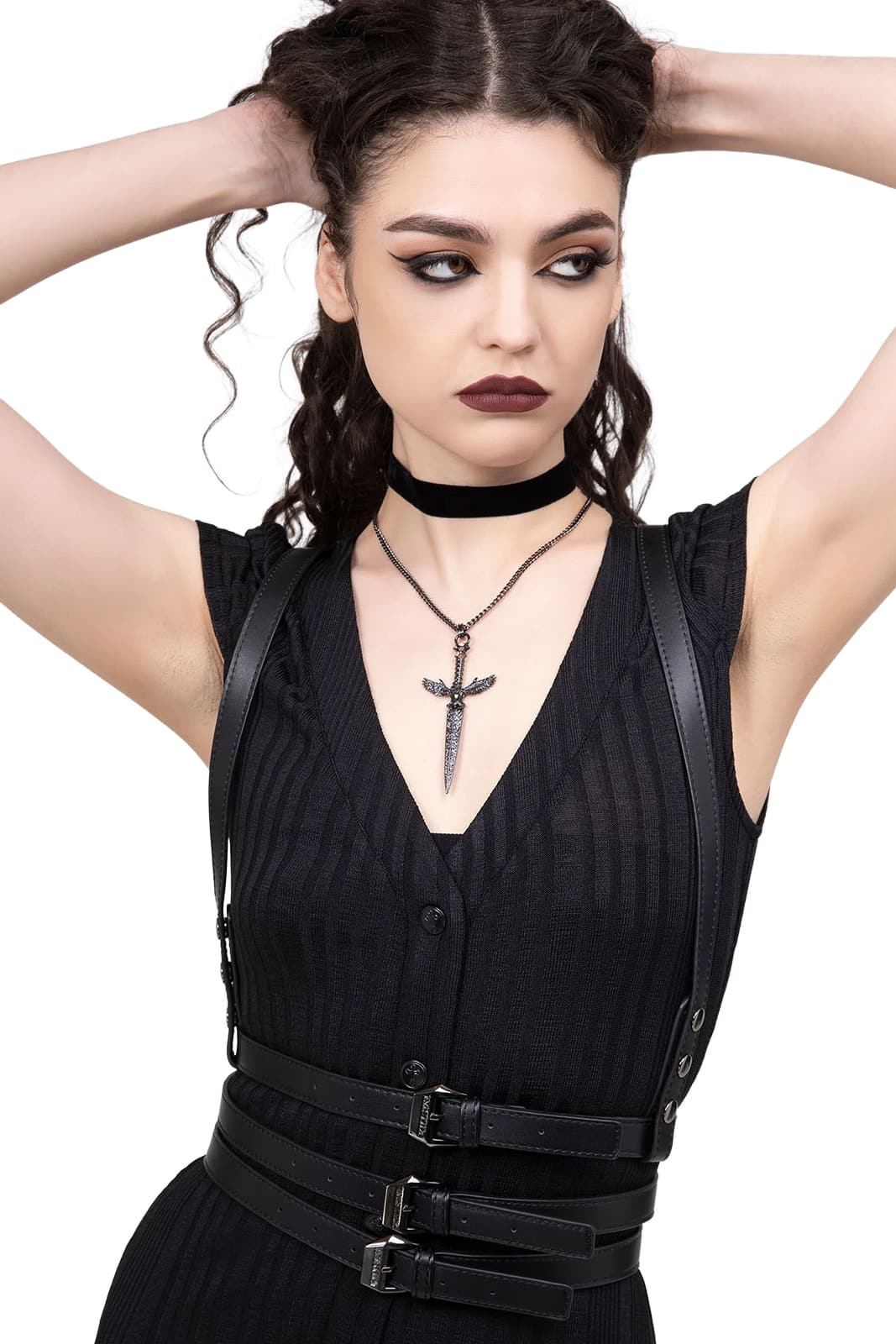 Gothic-Harness mit drei verstellbaren Riemen mit Sarggürtelschnalle um die Taille. Die Schultergurte sind ebenfalls verstelolbar und mit Druckknopfverschlüssen bestückt.