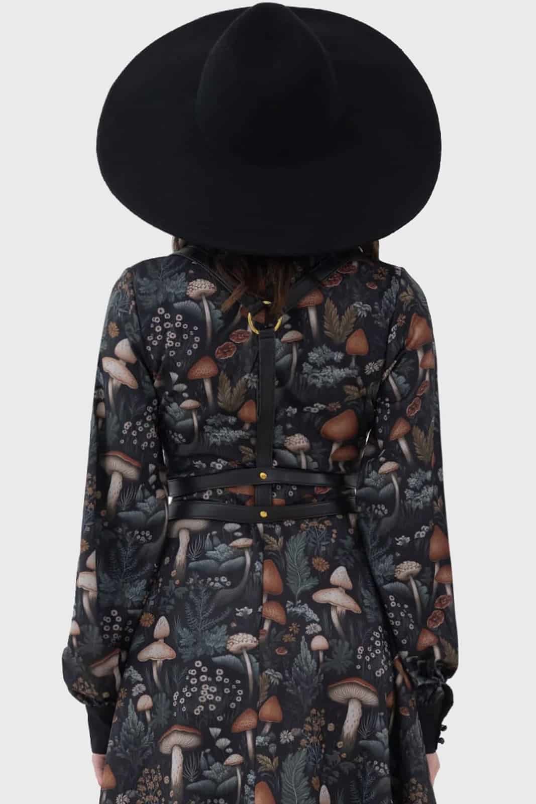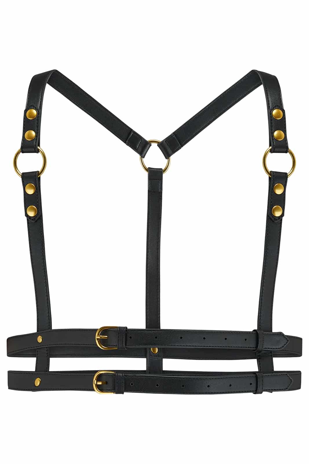 Dieses Harness aus Kunstleder setzt ein starkes Fashion-Statement und verleiht jedem Outfit eine markante Silhouette. Die goldfarbenen Metallelemente sorgen für edle Kontraste, während die verstellbaren Riemen und der Schnallenverschluss eine individuelle Passform ermöglichen. Perfekt für Layering über Kleidern, Tops oder als Highlight für alternative Styles.