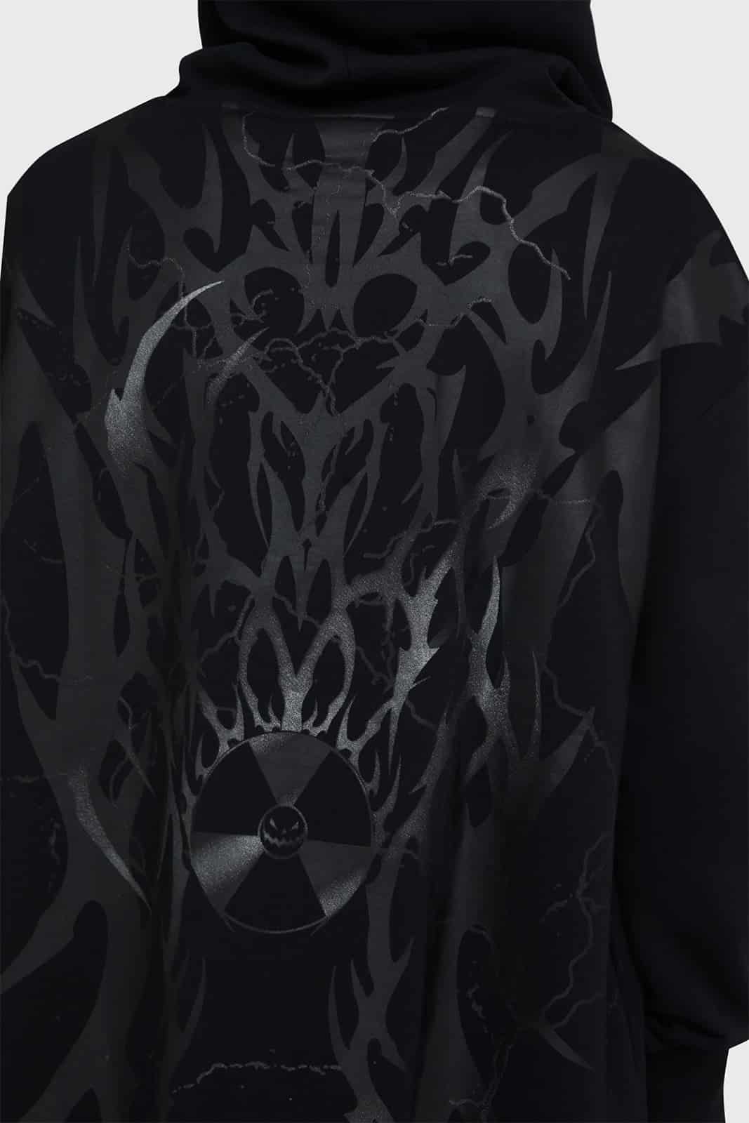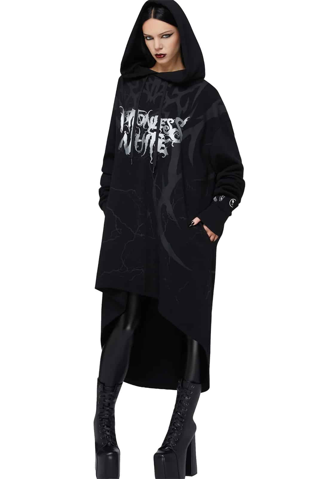 Dieser lange Hoodie im Cloak-Style aus der Motionless In White x KILLSTAR Kollaboration vereint düstere Eleganz mit maximalem Komfort. Der weiche, hochwertige Sweatstoff fällt locker und fließend, während der markante Front- und Backprint dem Design eine eindringliche Präsenz verleiht. Mit Kapuze, praktischen Seitentaschen und extra langer Silhouette ist dieses Piece ein echtes Statement zwischen Darkwear, Streetwear und moderner Ritual-Ästhetik.