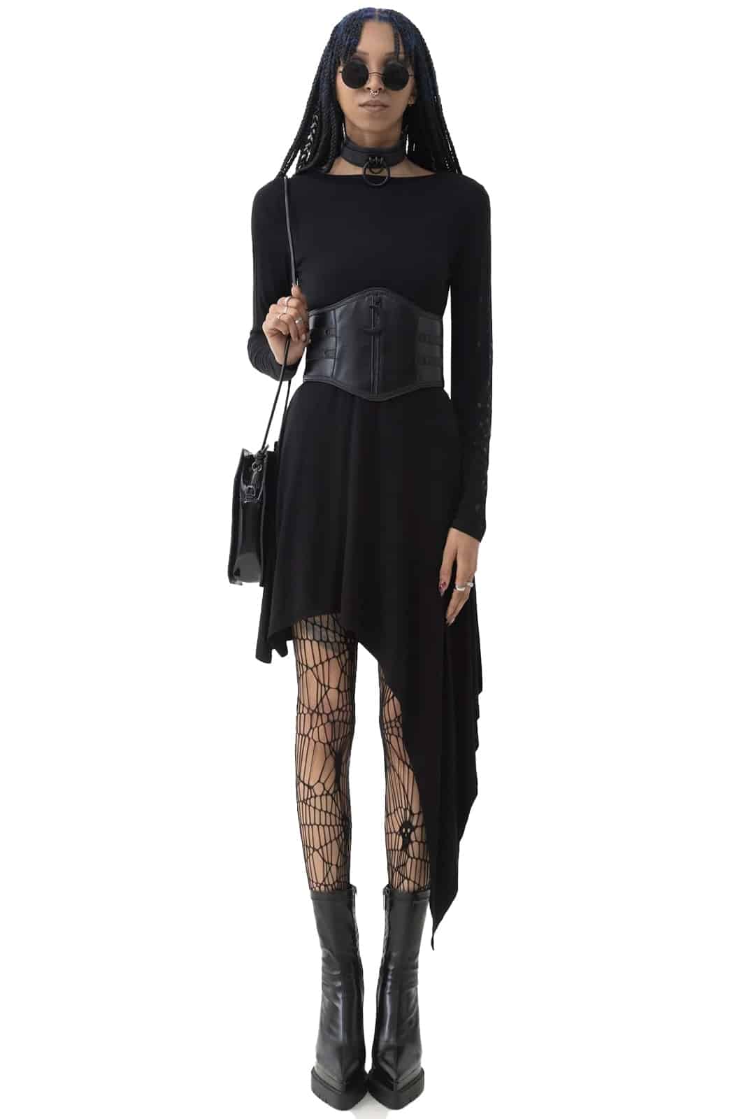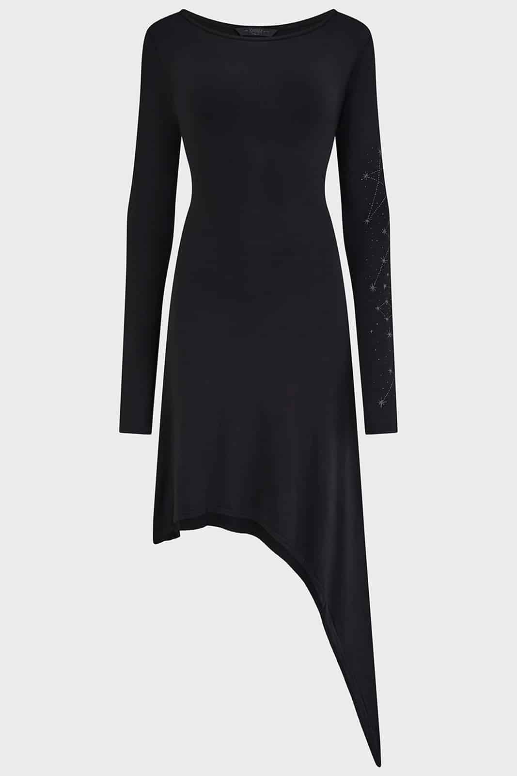 Gothic Kihilist Kleid mit Rundhalsausschnitt und langen Ärmeln. Der linke Arm ist mit einem von Sternenkarten inspiriertem Kunstwerk bedruckt. Der Saum ist extram asymmetrisch.