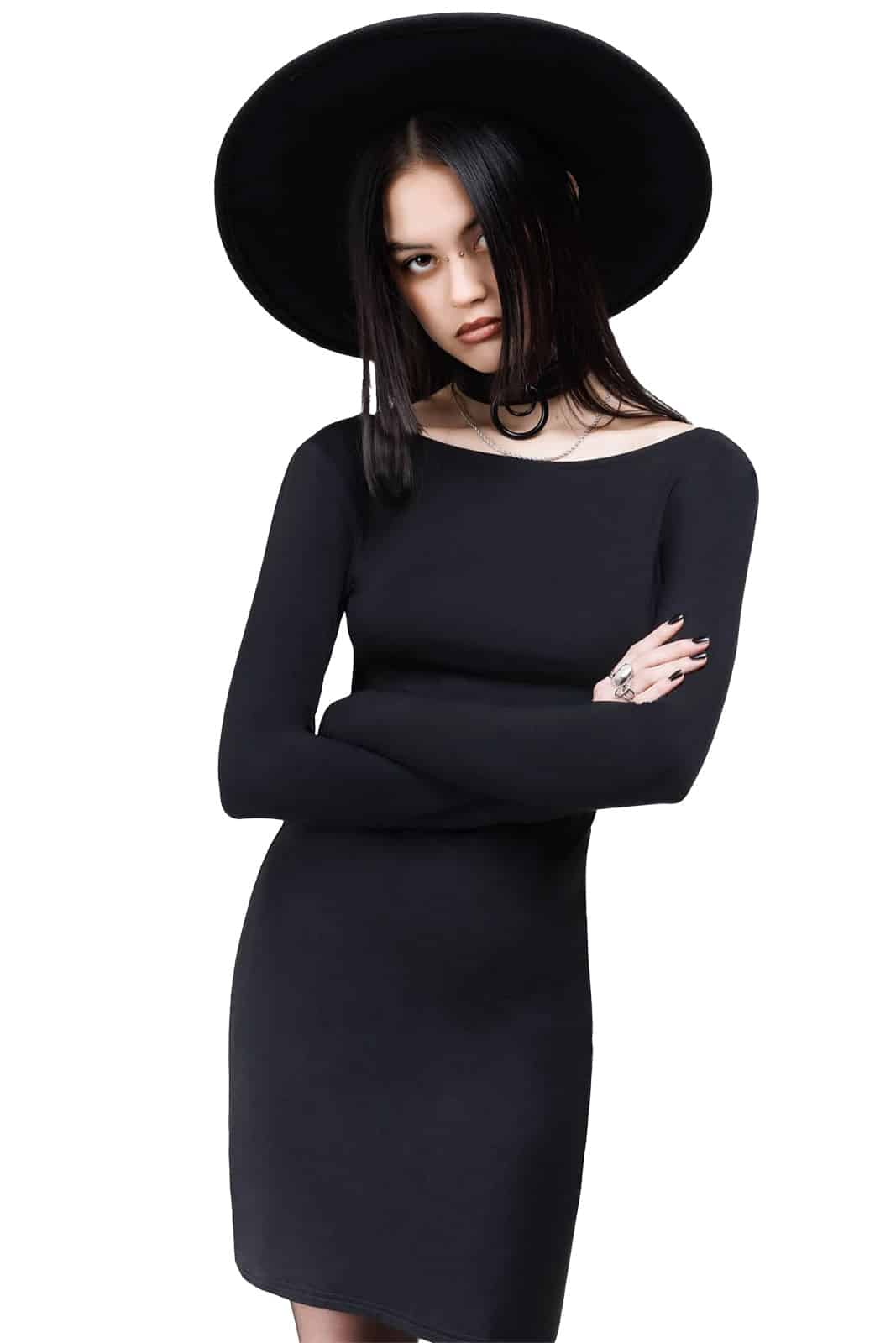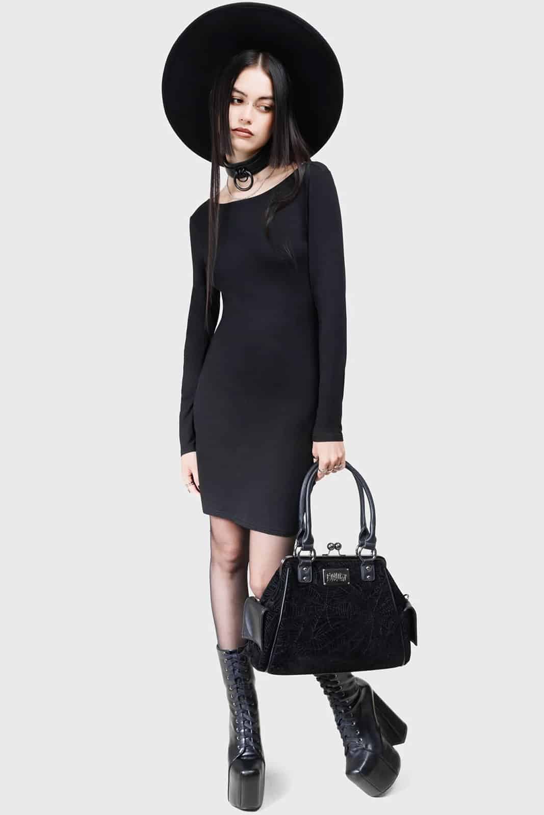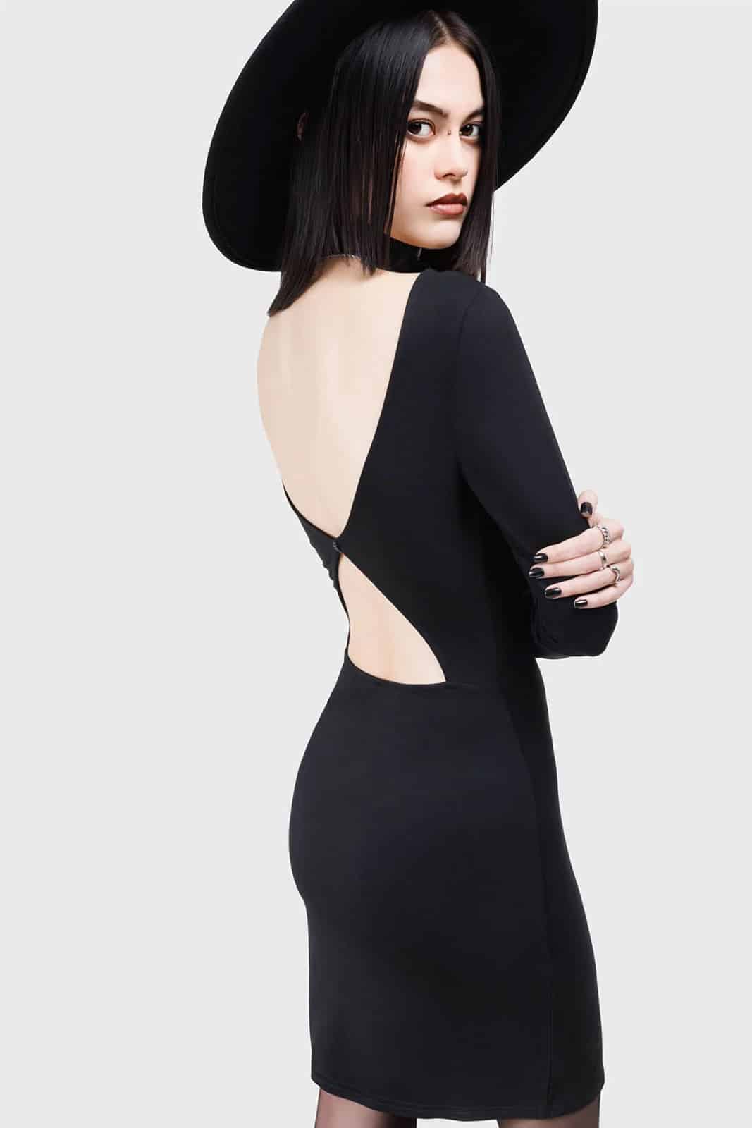 Gothic Kihilist Kleid aus weichem Stretch mit langen, taillierten Ärmeln und Rundhalsausschnitt. Der offene Rücken ist mit einem Totentopfknopf verziert.