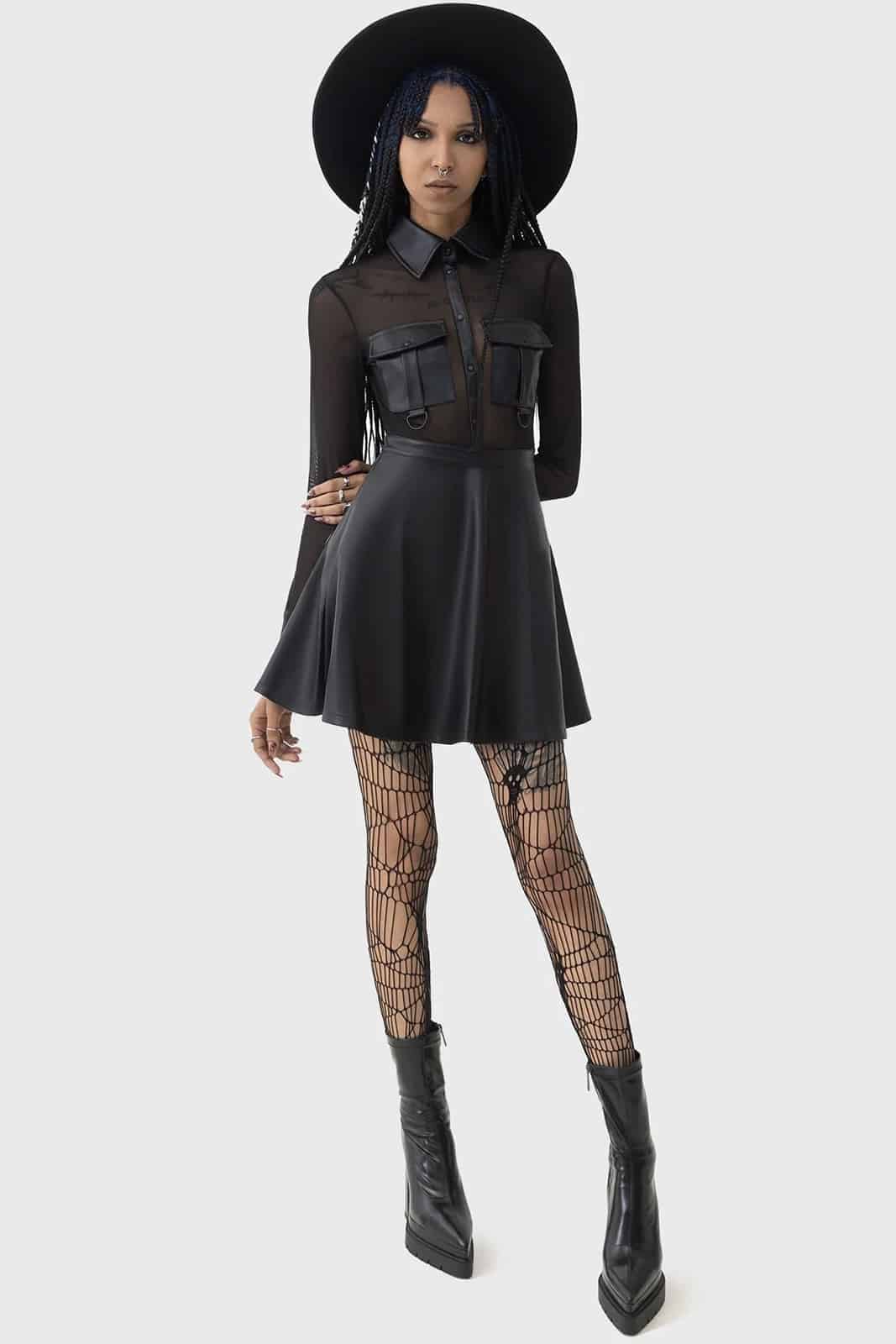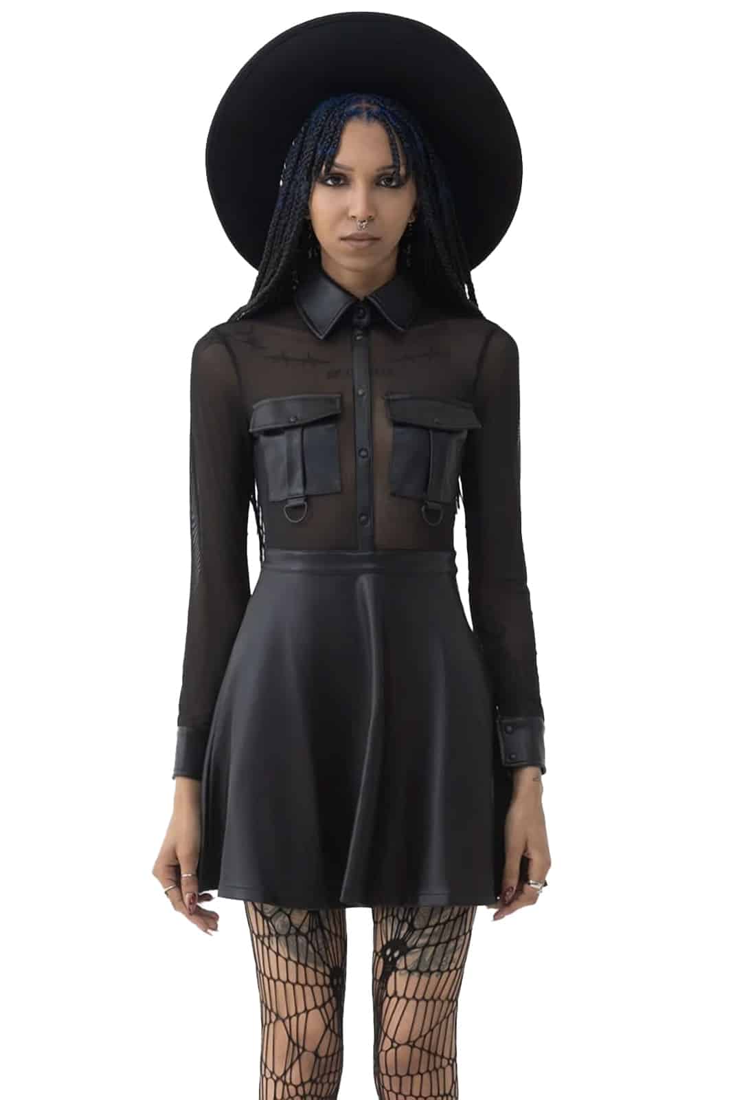 Süßes Kihilist Minikleid mit Oberteil aus zartem Mesh-Material mit langen Ärmeln und zwei aufgesetzten Taschen im Brustbereich. Der kurze Rock ist aus weichem Kunstleder mit seitlichem Reißverschluß.