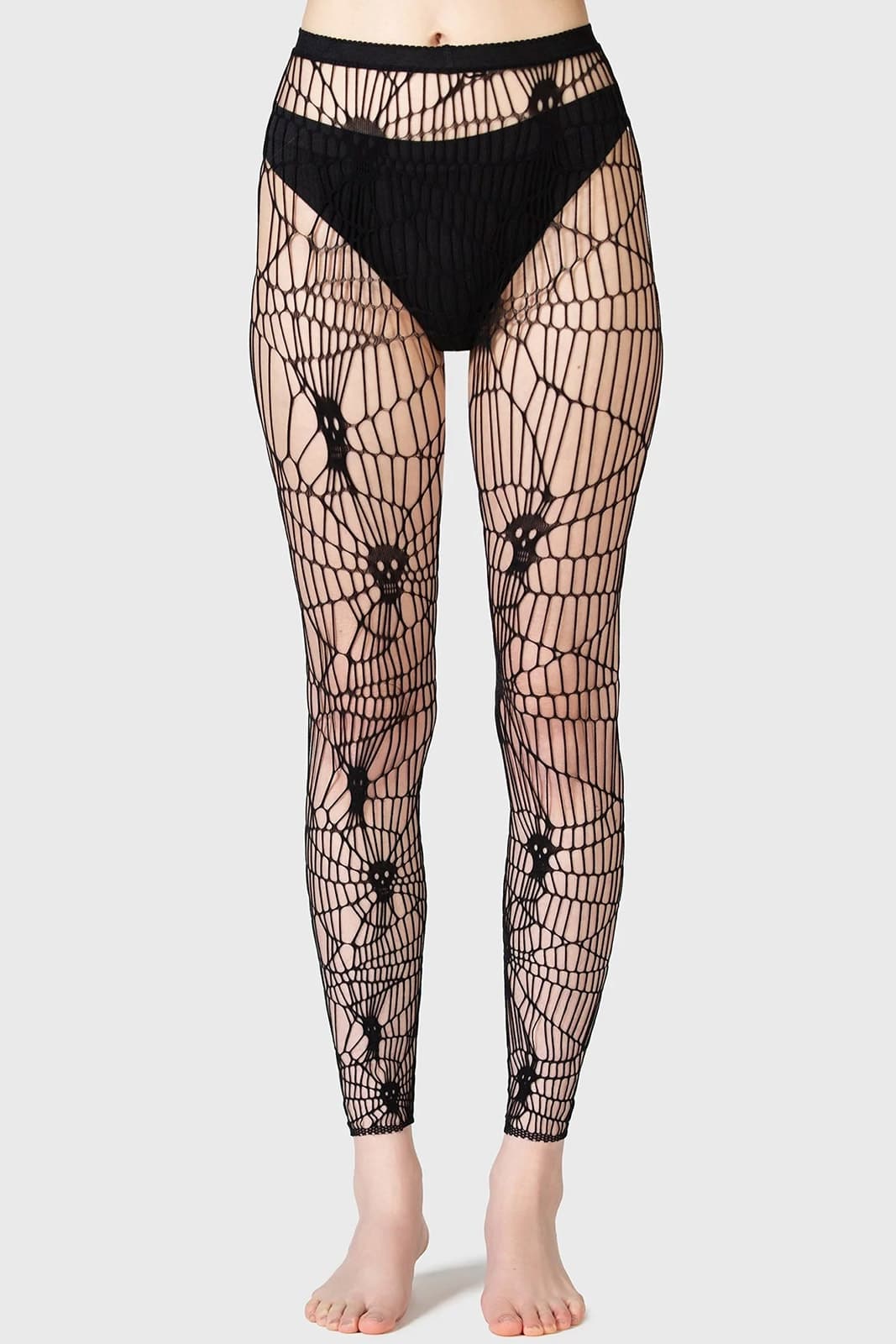 Leggings aus weichem, dehnbarem Netzmaterial mit eingewebten Totenköpfen. Der hoch tailliert Bund ist bequem und elastisch.