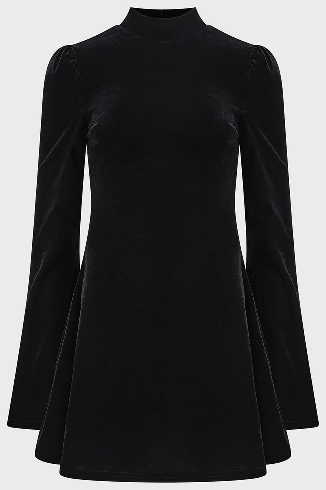 Elegantes Minikleid aus hochwertigem, glattem Samt mit luxuriösem Griff. Die klare Silhouette mit hohem Ausschnitt und weich fallendem Rock trifft auf lange Ärmel mit dezent ausgestelltem Abschluss und verleiht dem Kleid eine zeitlose, dunkle Eleganz. Ein feminines Statement für Gothic-, Darkwear- und elegante Abendlooks, entworfen in Brighton, England.