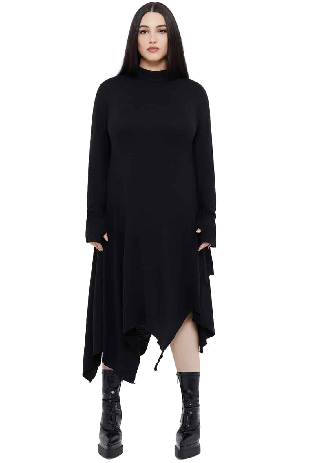 Schlicht und dennoch ausdrucksstark – dieses Kleid bringt minimalistische Gothic-Ästhetik perfekt zur Geltung. Der weiche Slub-Jersey sorgt für angenehmen Tragekomfort, während der asymmetrische Saum und die dezente Taillennaht dem Look Bewegung und Tiefe verleihen. Ein vielseitiges Piece, das sich sowohl casual als auch edel kombinieren lässt.