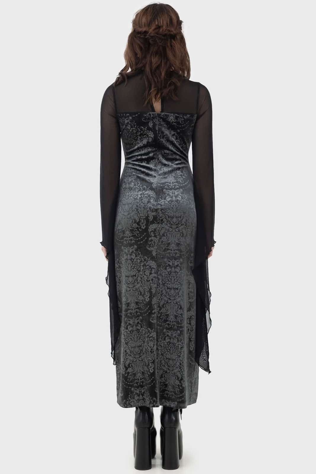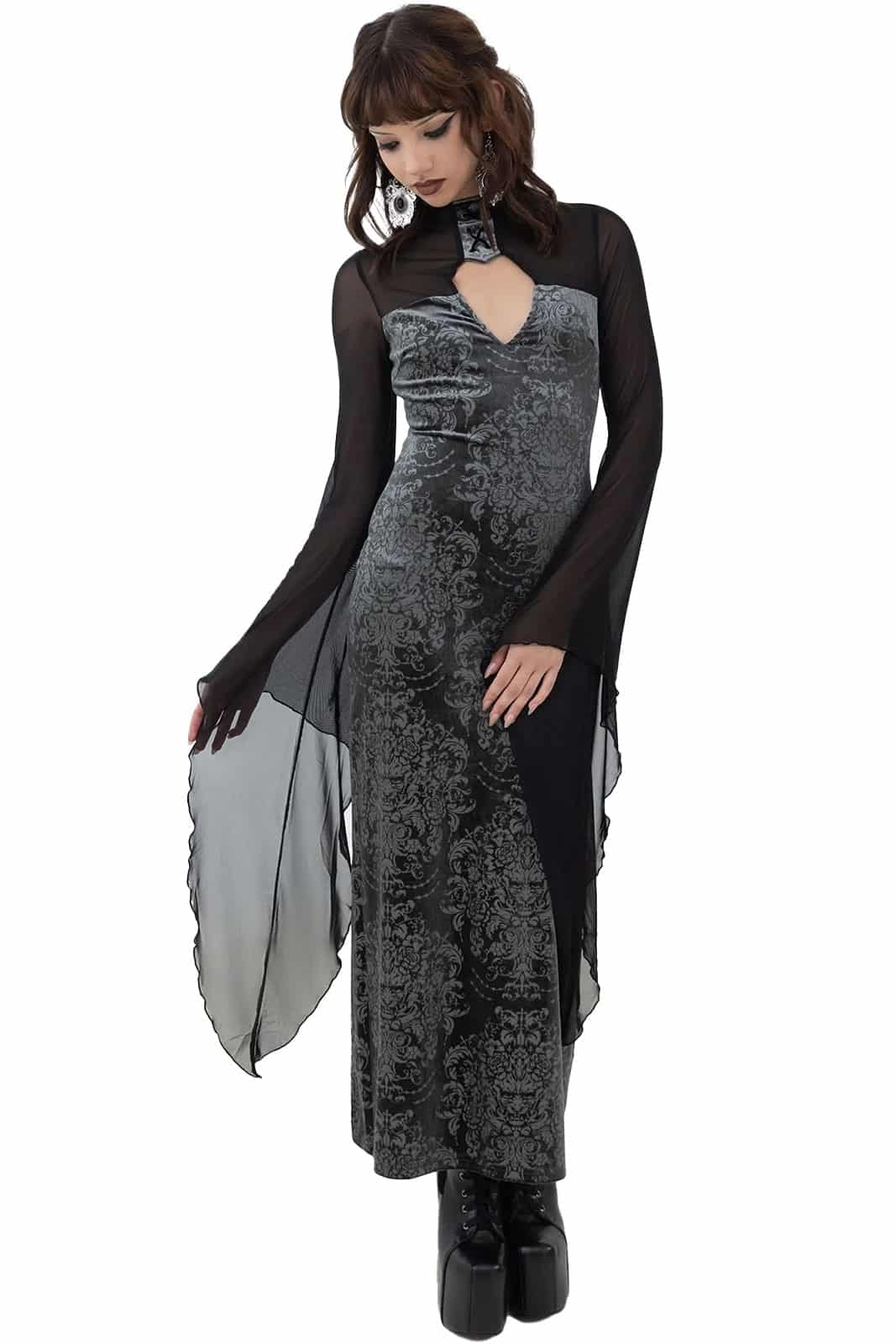 Ein teuflisches Gothic-Kunstwerk überzieht den geprägtem Metallic-Samt des bodenlangen Kleides. Bolerogleich umhüllt ein feines Netzmaterial die Arme und die Schultern. Ein herzförmiges Schlüssellochdetail verziert den Ausschnitt.