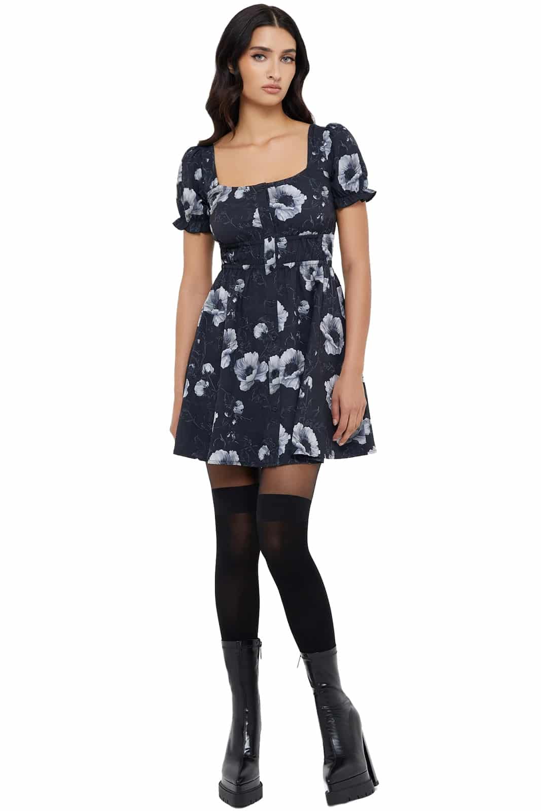 Ein Kleid voller dunkler Poesie – zarte Blumen in kontrastierendem Grau zieren den schwarzen Stoff und verleihen ihm eine geheimnisvolle Anmut. Der romantische Schnitt mit Puffärmeln und gerafften Nähten schmeichelt der Silhouette, während die Knopfleiste vorn verspielte Leichtigkeit hinzufügt. Ein Kleid, das wie geschaffen ist für mondbeschienene Nächte und verträumte Augenblicke.
