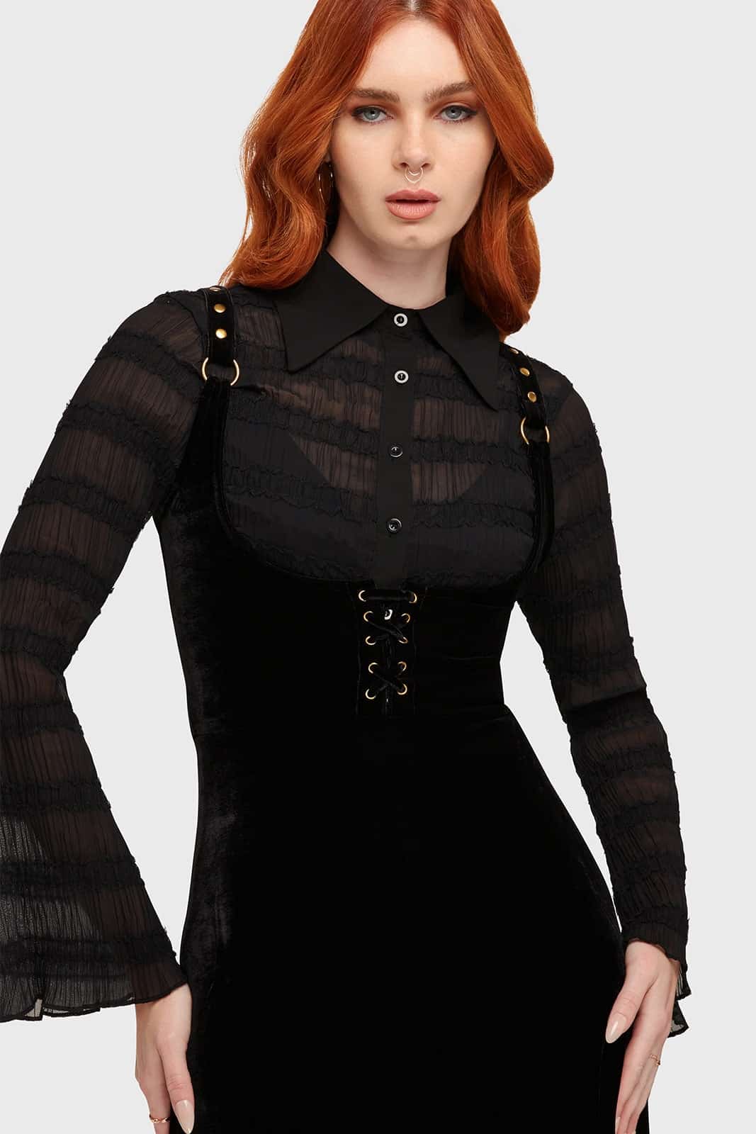 Ein ausdrucksstarkes Underbust-Maxikleid, das sich perfekt mit Blusen, Tops oder Bodys kombinieren lässt. Der softe, tiefschwarze Stretch-Samt sorgt für eine elegante, körpernahe Silhouette, während Schnürdetails und goldfarbene Hardware dem Design eine edle, düster-romantische Note verleihen. Ein vielseitiges Statement-Piece für Gothic- und Alternative-Looks mit individueller Stylingfreiheit.