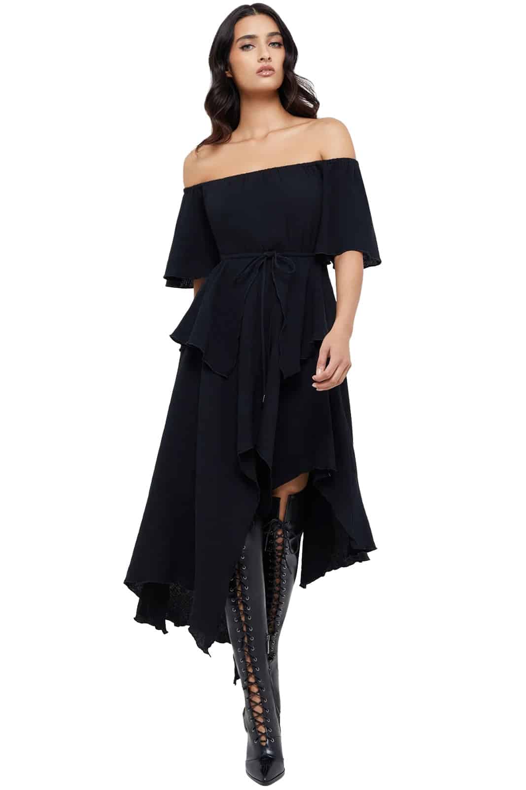 Dieses Kleid vereint romantische Eleganz mit einem Hauch von Boho-Charme. Mit seinem femininen Off-Shoulder-Schnitt, dem fließenden Stoff und dem asymmetrischen Saum wirkt es sowohl verspielt als auch geheimnisvoll – perfekt für sommerliche Abende oder besondere Anlässe mit dunkler Note.