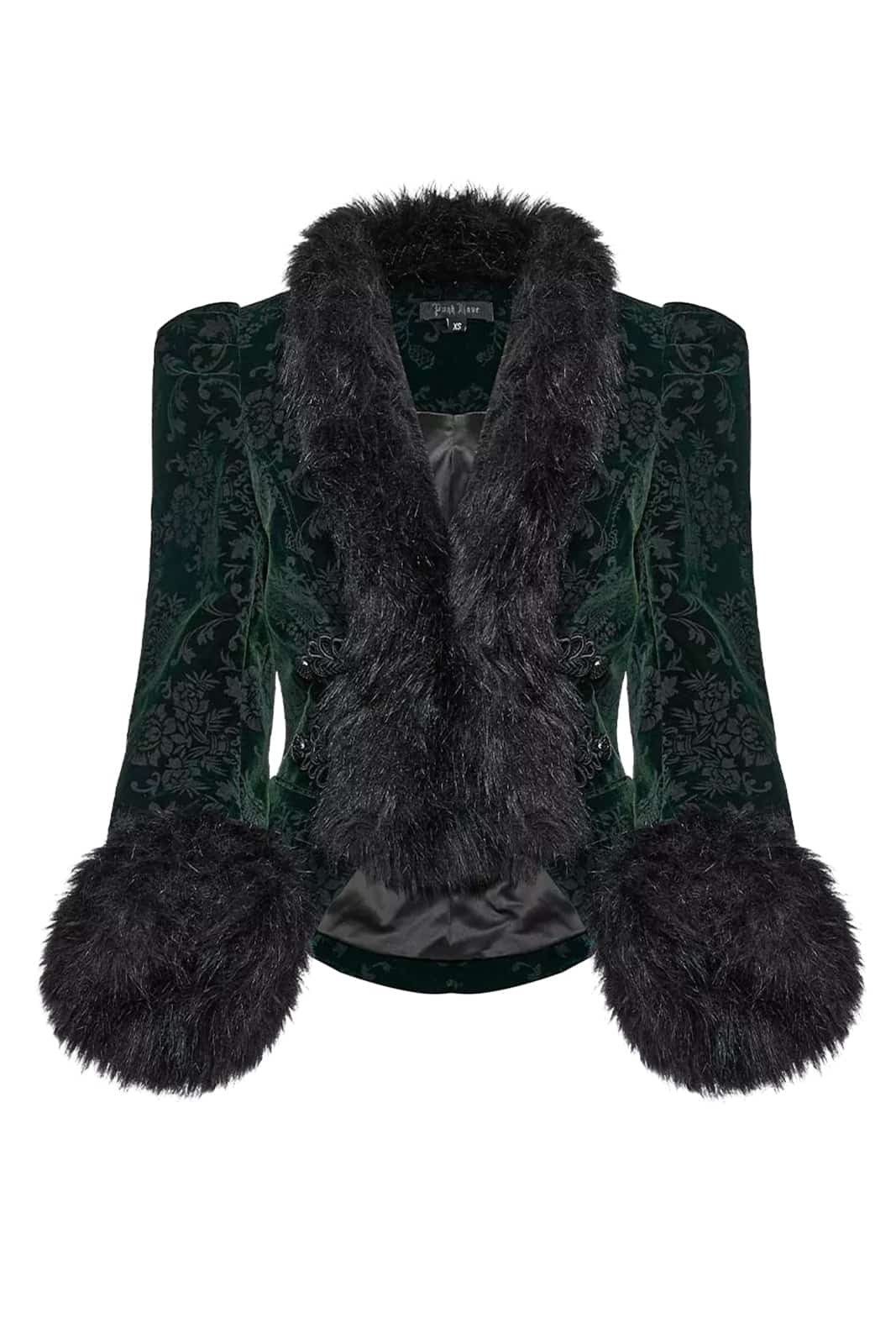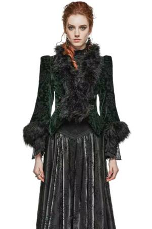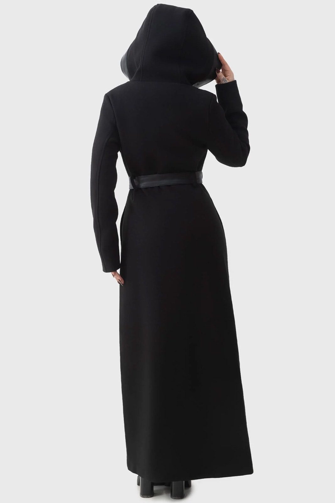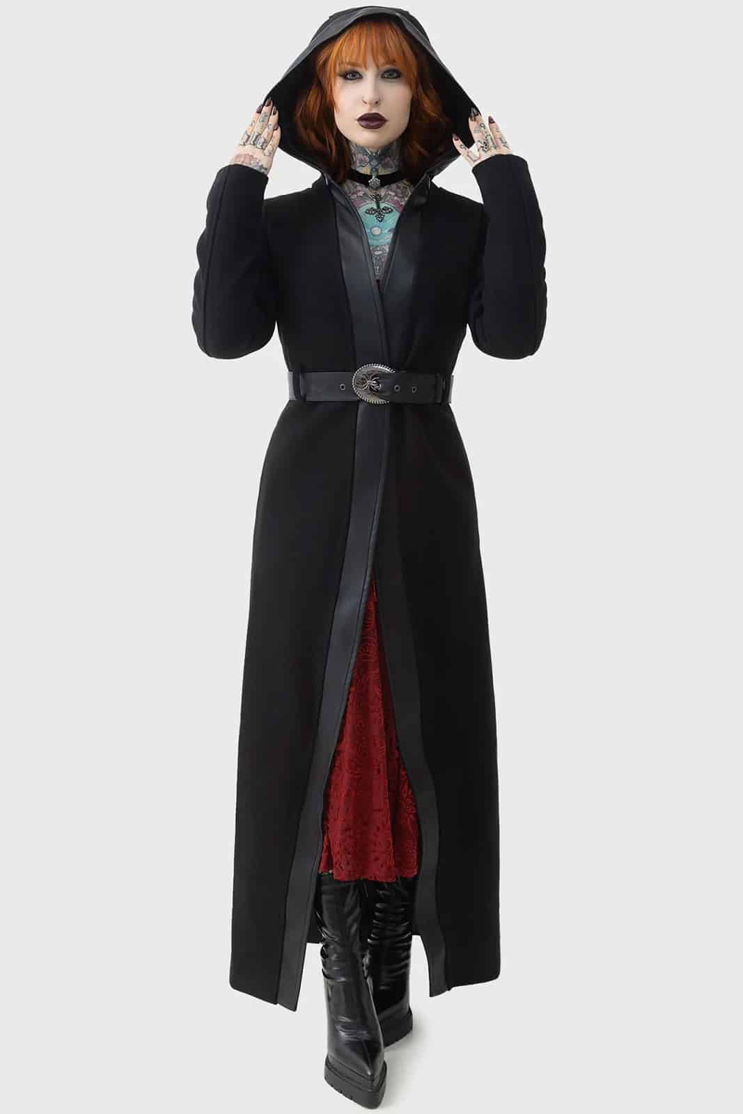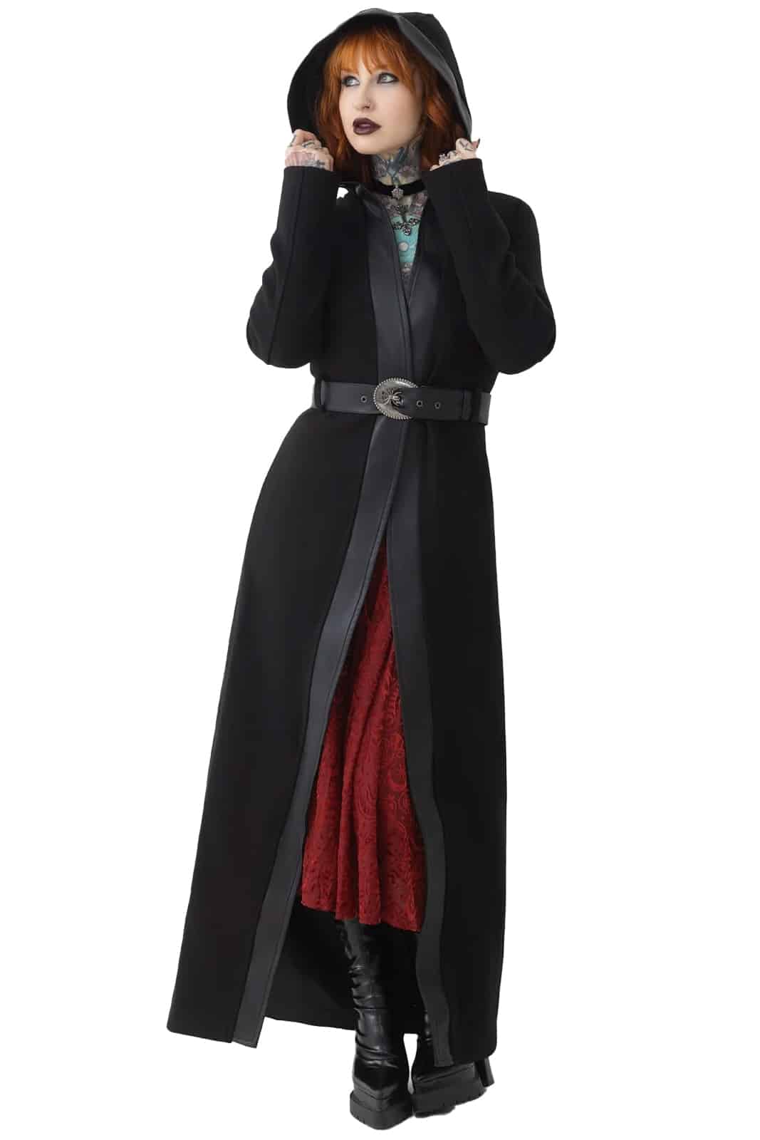 Bodenlanger Gothic-Mantel aus weicher, gekochter Kunstwolle mit langen Ärmeln und seitlichen Taschen. Bei schlechtem Wetter schützt eine übergroße Kapuze vor Regen, Wind und Schnee. Innen vollständig gefüttert. Die Öffnung an der Front ist beidseitig mit einem Kunstlederstreifen verziert. Verschlossen wird der Mantel mit einem Gürtel mit Spinnen-Schnalle.