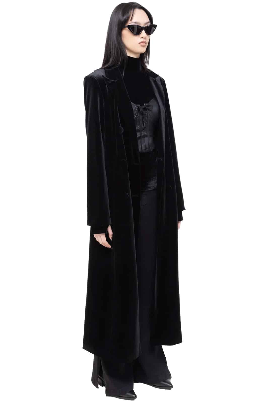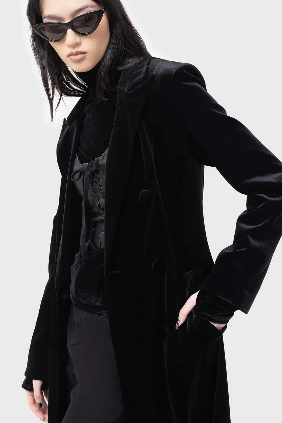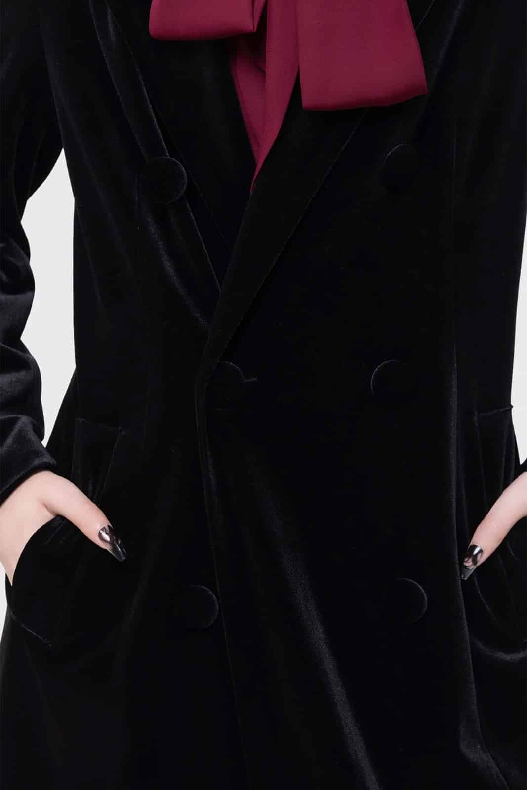 Eleganter langer Mantel aus weichem Velvet mit klarer Linienführung und einer markanten, figurbetonten Silhouette. Schulterpolster und überzogene Knöpfe setzen dezente Akzente, während der Gehschlitz hinten für Bewegungsfreiheit sorgt. Voll gefüttert und mit praktischen Taschen ausgestattet – ein zeitloses Statement für dunkle, edle Looks.
