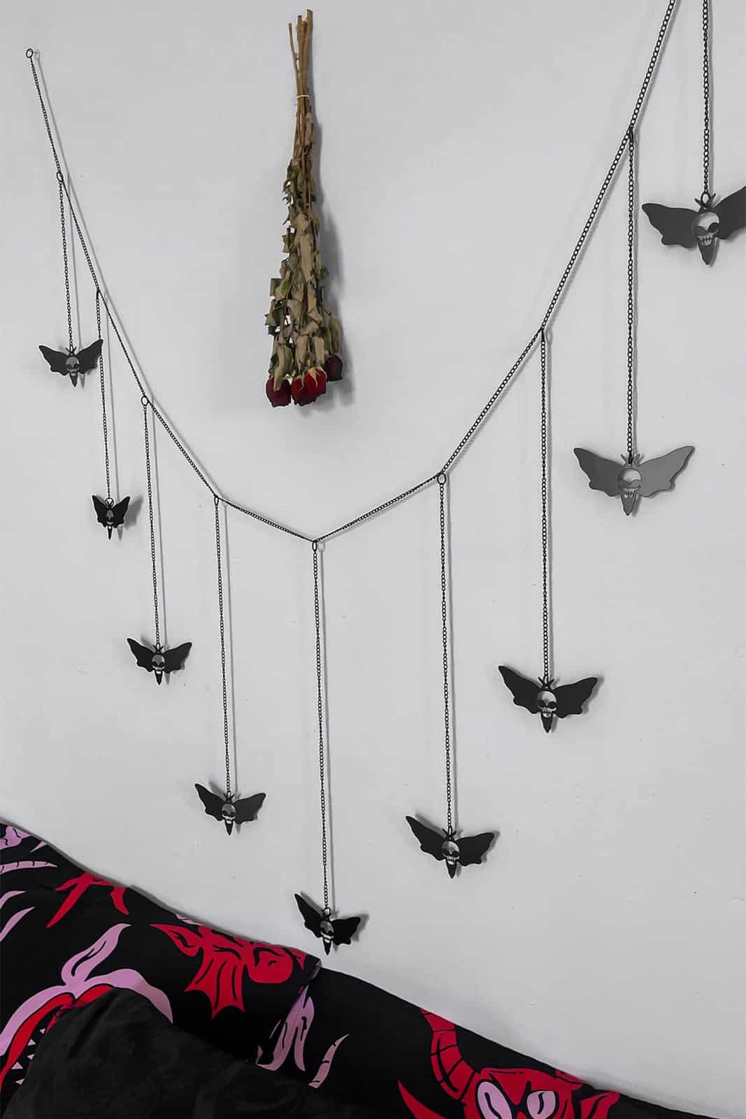 Mobile im Occult Style aus mattschwarzem Metall mit einer Horde aus schwarzen Motten.