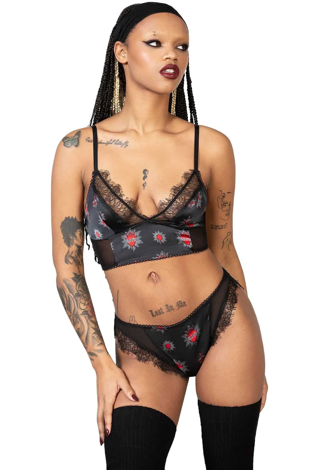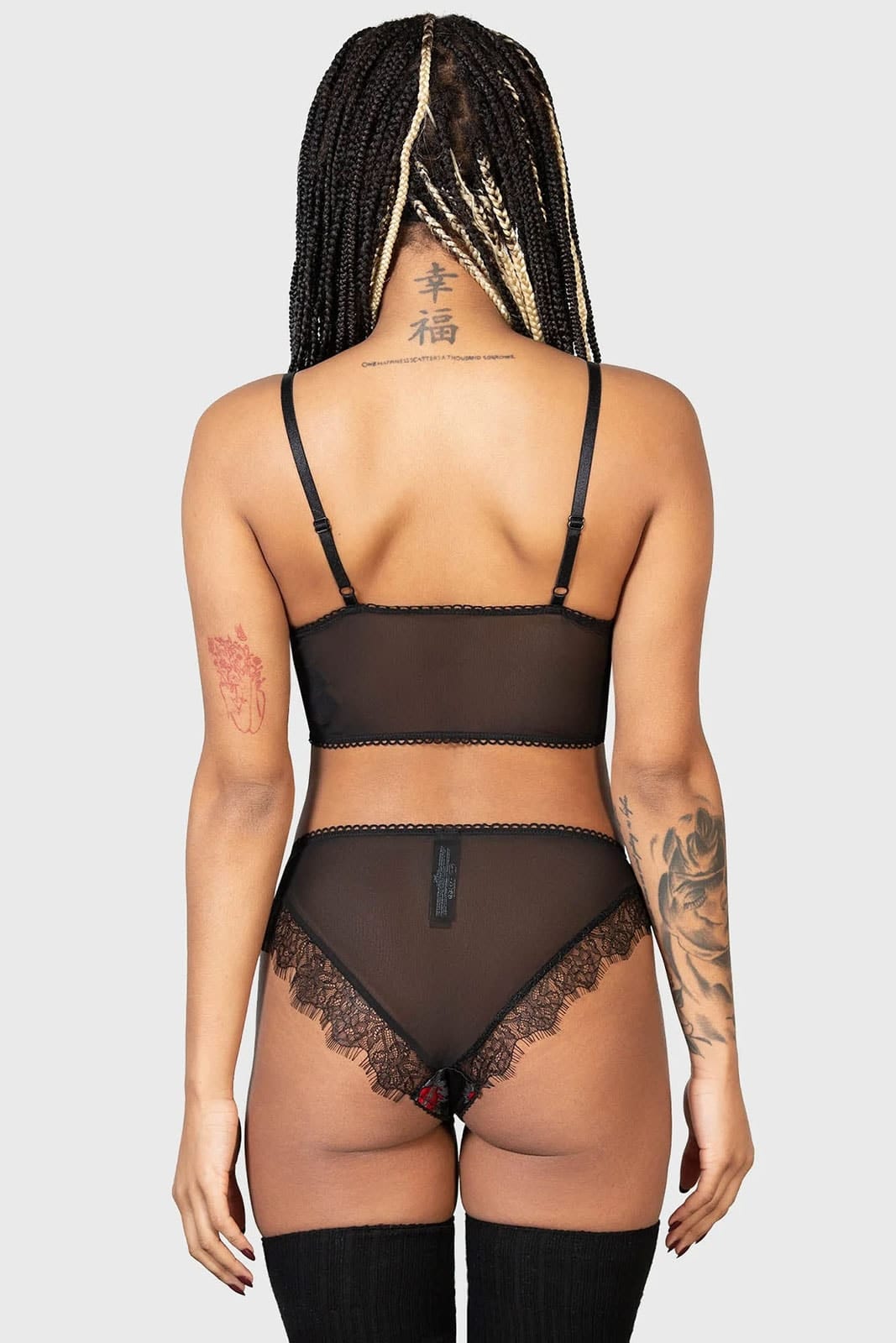 Inspiriert vom Heiligen Herz und Kreuz Design präsentiert sich das BH-Top Star Crossed mit zartem Spitzenbesatz und weichen Mesh-Einsätzen. Der Zwickel ist gefüttert.