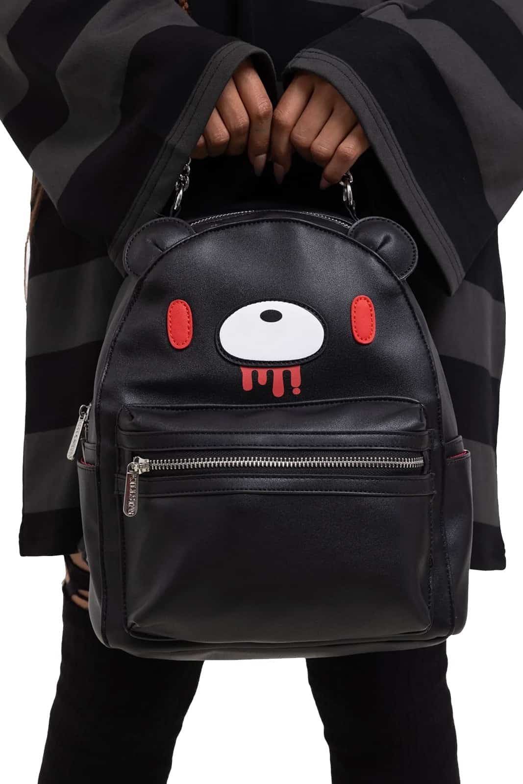 Süßer Rucksack aus glattem Kunstleder mit Gloomy-Bear Design. Ausgestattet mit verstellbaren Schultergurten. Taschen finden sich sowohl seitlich als auch an der Front und im vollständig rot gefütterten Innenbereich. Verziert mit Kettendetails.