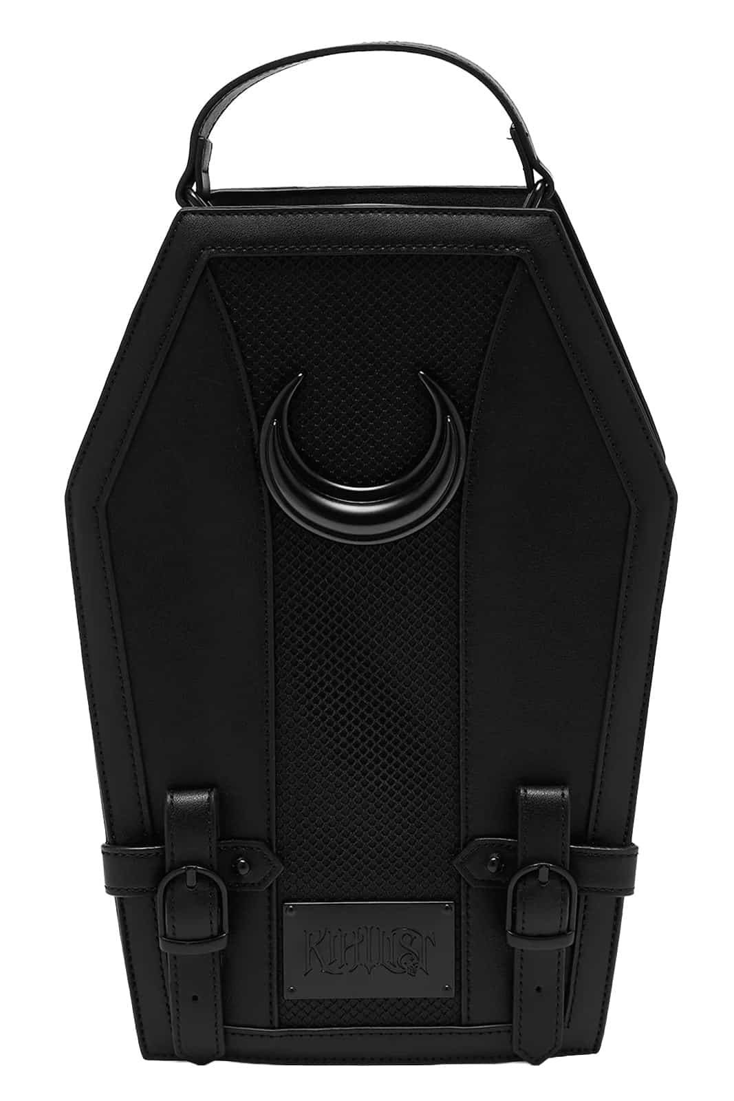 Ein ausdrucksstarker Rucksack in ikonischer Sargform, der düstere Ästhetik mit funktionalem Design verbindet. Das zentrale Panel mit überlegtem Fishnet-Detail und die markante schwarze Mondsichel-Hardware verleihen diesem Statement-Piece eine unverwechselbare Silhouette – perfekt für Alltag, Events oder als Highlight zu deinem Gothic-Look.