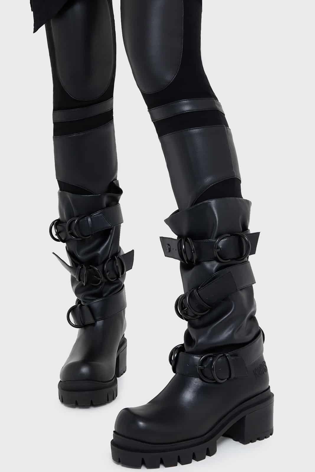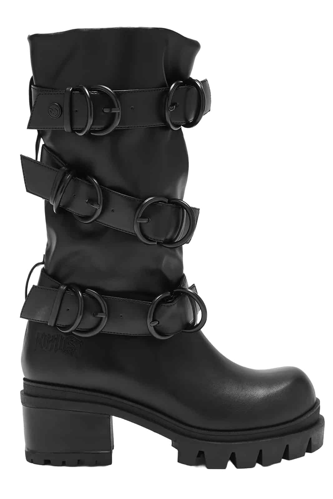 Diese Boots sind ein echtes Statement-Piece für deine Gothic-Garderobe. Der weiche PU-Look in lässiger Slouchy-Form kombiniert mit massiven Riemen und Schnallen sorgt für eine markante Silhouette, die jedes Outfit sofort aufwertet. Ob als Gothic Basic im Alltag oder als Everyday Goth Essential für Festivals und Nächte im Club – diese Stiefel sind gemacht für starke Auftritte.