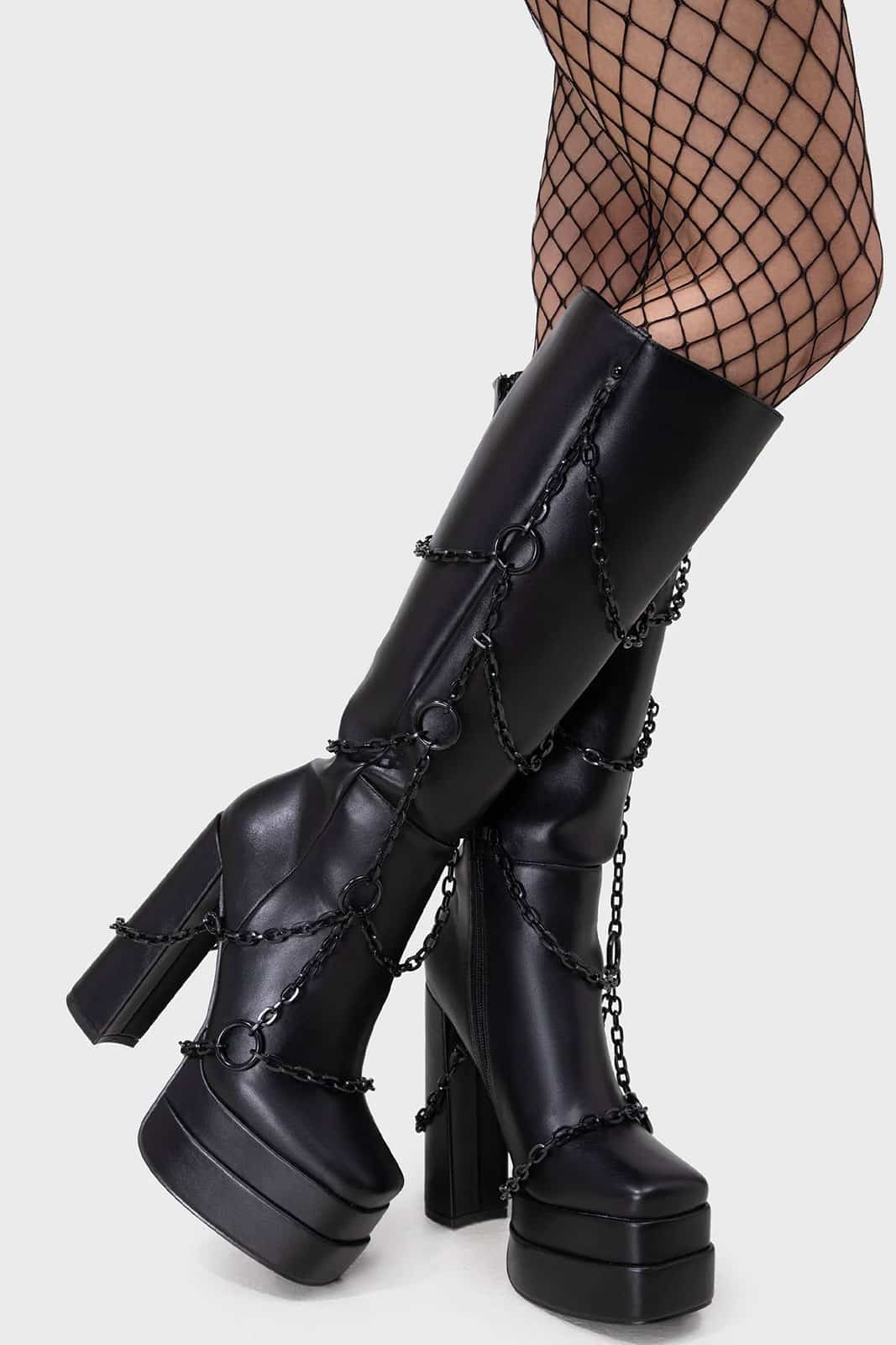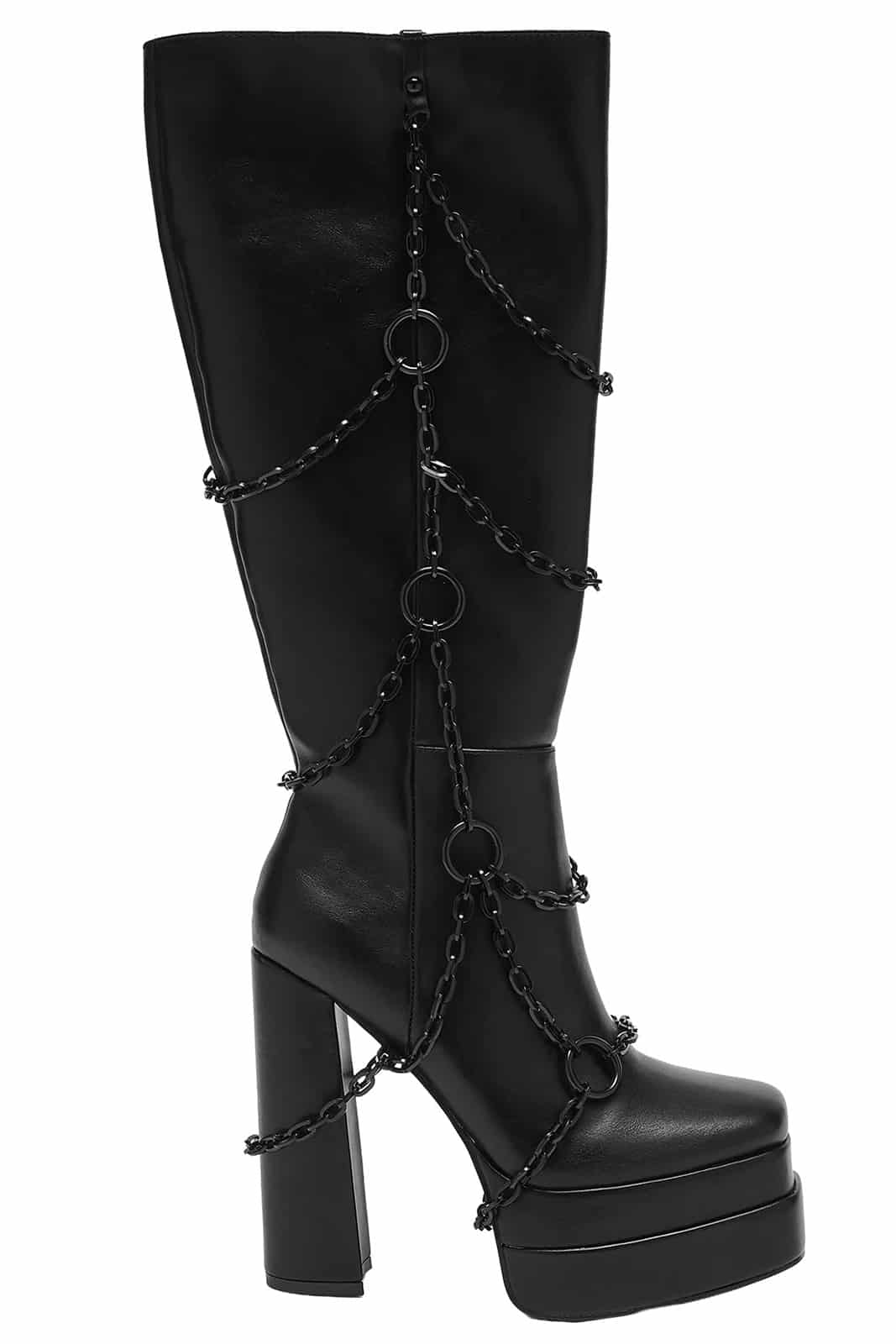 Aus veganem Kunstleder gefertigt und mit schwarzen Ketten bestückt. Auf der Innenseite mit Reißverschluß für einfaches und schnelles An- und Ausziehen. Vorn mit breitem, geraden Zeh. Mit 14,5 cm hohem Blockabsatz und 5 cm starkem Plateau.