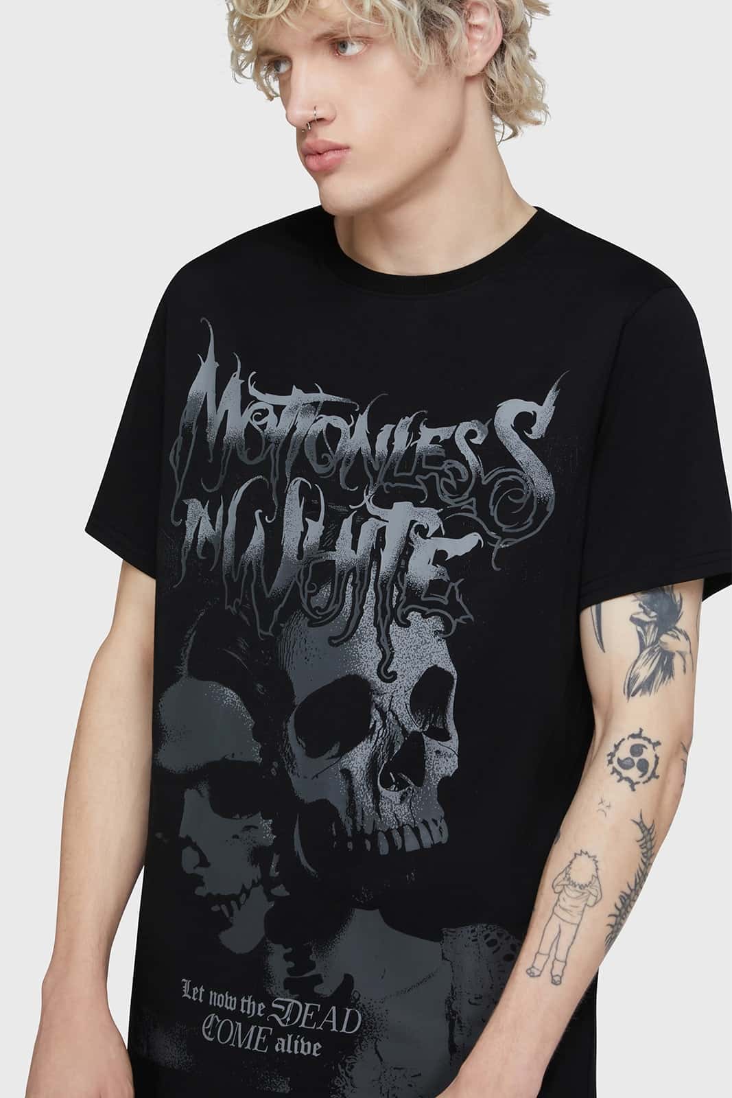 Dieses oversized T-Shirt aus der Motionless In White x KILLSTAR Kollaboration setzt ein kompromissloses Statement zwischen Darkwear und Band-Merch-Ästhetik. Der großflächige Frontprint mit düsterem Skull-Motiv und Schriftzug verleiht dem Shirt eine starke visuelle Präsenz, während der weiche Baumwollstoff für hohen Tragekomfort sorgt. Der lockere Schnitt macht es ideal für lässige Layering-Looks oder als Statement-Piece für sich allein.
