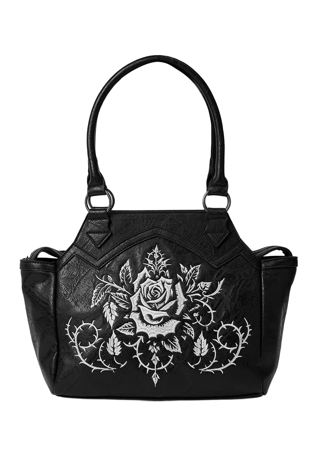 Diese elegante Handtasche vereint florale Romantik mit dunkler Gothic-Ästhetik. Das hochwertig strukturierte PU-Material trifft auf aufwendig gestickte Rosen- und Dornenelemente mit dezent schimmerndem Finish und verleiht der Tasche eine ausdrucksstarke, edle Wirkung. Dank der kompakten, aber geräumigen Form ist sie der perfekte Begleiter für Alltag und besondere Anlässe.