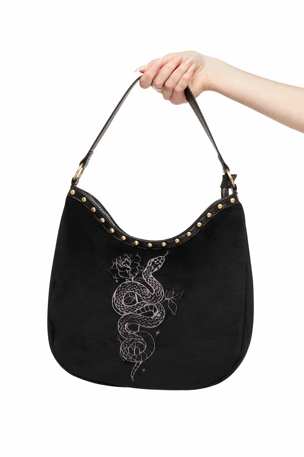 Serpent & Thorn ist eine ausdrucksstarke Schultertasche mit dunkler Eleganz und markantem Gothic-Charakter. Der strukturierte Samt verleiht der Tasche eine edle Tiefe, während die detailreiche Schlangenstickerei das Design geheimnisvoll abrundet. Goldfarbene Nieten und Beschläge setzen gezielte Akzente und machen die Tasche zu einem stilvollen Statement für Alltag und Abend.