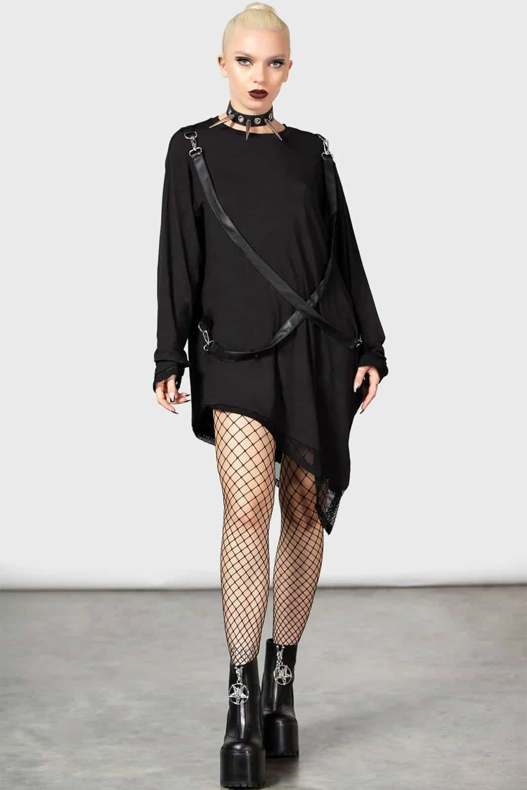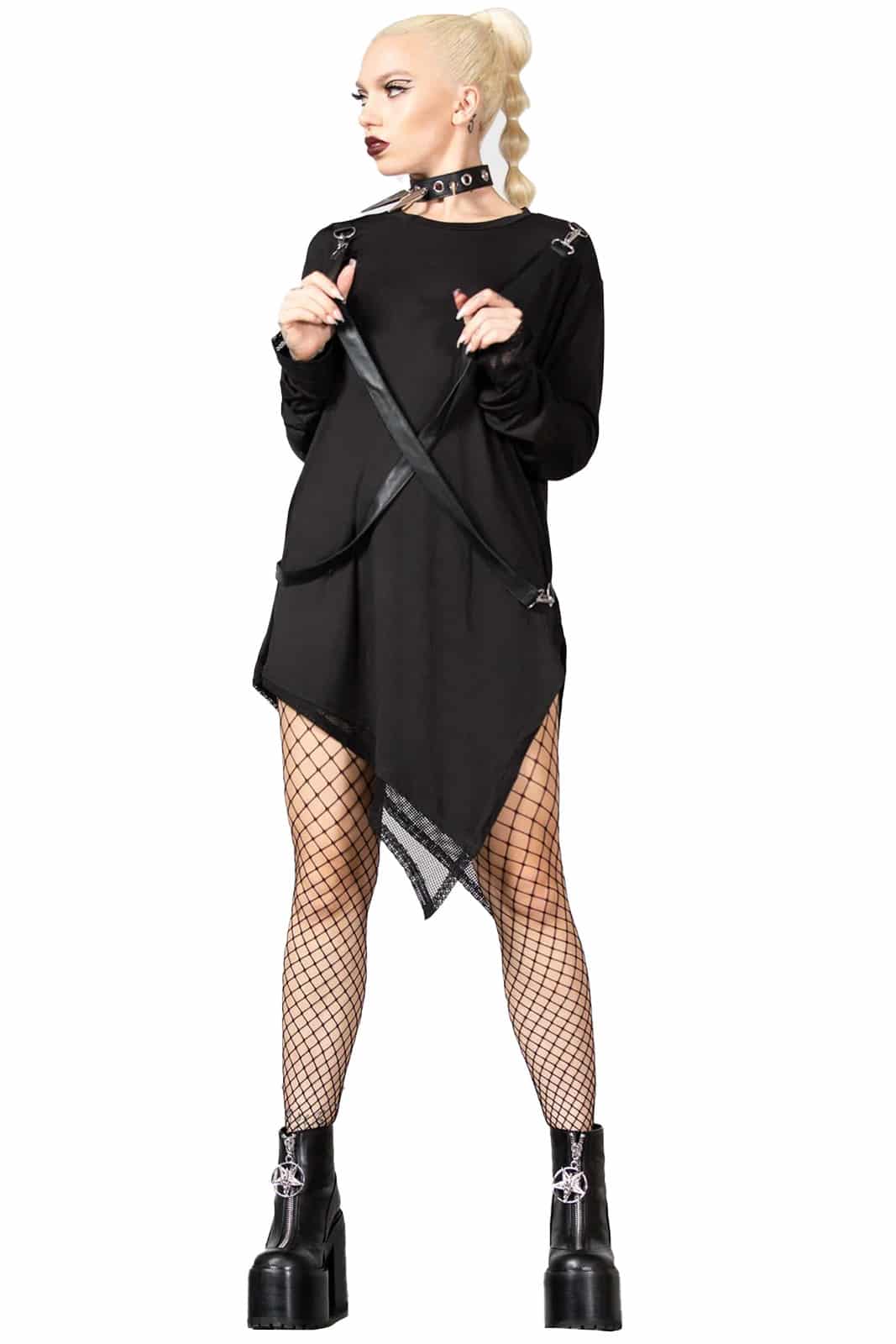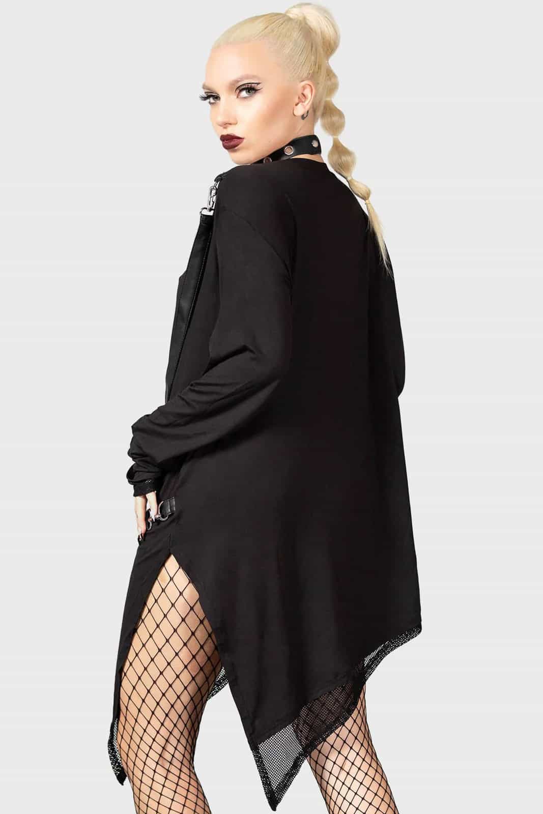 Lang geschnitten Damenoberteil mit Zipfelsaum und Netzeinsätzen. Ausgestattet mit abnehmbaren Kunstlederriemen. Mit langen Ärmeln und Rundhalsausschnitt. Das Material ist super-stretchig und angenehm zu tragen.
